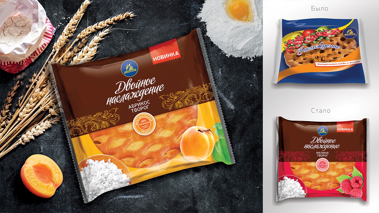 Основное отличительное свойство продукта — двойная, насыщенная вкусом и ароматом начинка из творога и натуральных фруктовых наполнителей, а также нежное, воздушное тесто. Поэтому названия начинок и пиктограмму с обозначением состава пирога дизайнеры поместили в центральную зону, а образы вкусовых наполнителей расположили в нижней части упаковки.