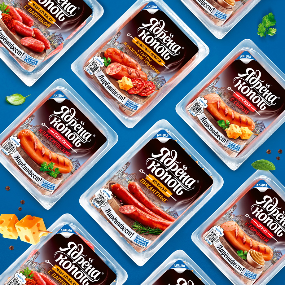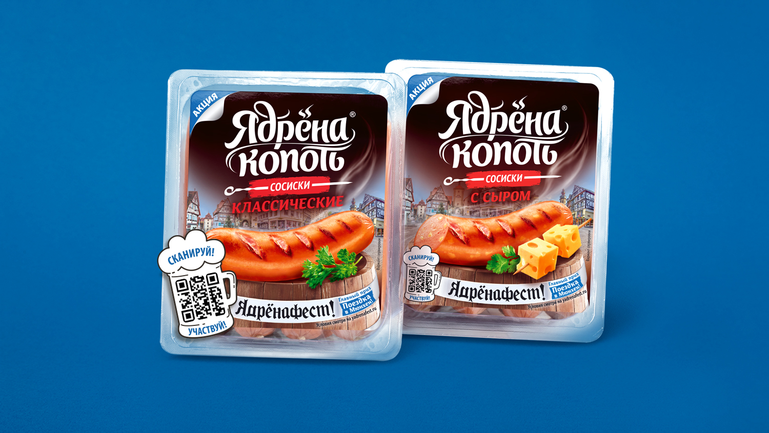 Специальный дизайн в стиле «Октоберфест» размещён на упаковках самых популярных позиций бренда «Ядрёна копоть»: сосисках и колбасках. В качестве фона этикетки использован вид небольшого немецкого городка. На переднем плане, на обруче бочонка, размещено название «Ядрёнафест», написанное специальным шрифтом в стилистике фестиваля «Октоберфест». В дизайне использованы белый и голубой цвета, символизирующие баварский флаг.