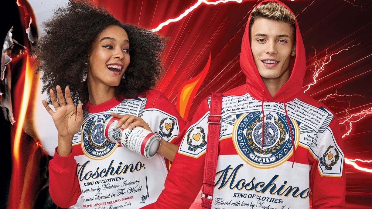 В коллекцию одежды от Moschino вошли кофты, штаны, рубашки и другие предметы одежды, украшенные своеобразными версиями этикетки Budweiser.