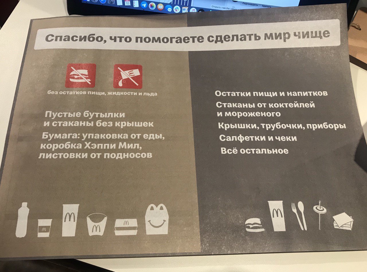 «Макдоналдс» использует два контейнера: серого цвета для общего мусора и бежевого для отходов, которые отвезут на переработку. Чтобы объяснять посетителям, как правильно сортировать мусор, над контейнерами установили памятки. Информацию напечатали и на бумаге для подносов. Также «Макдоналдс» обучил сотрудников, которые помогут желающим разобраться в сортировке.