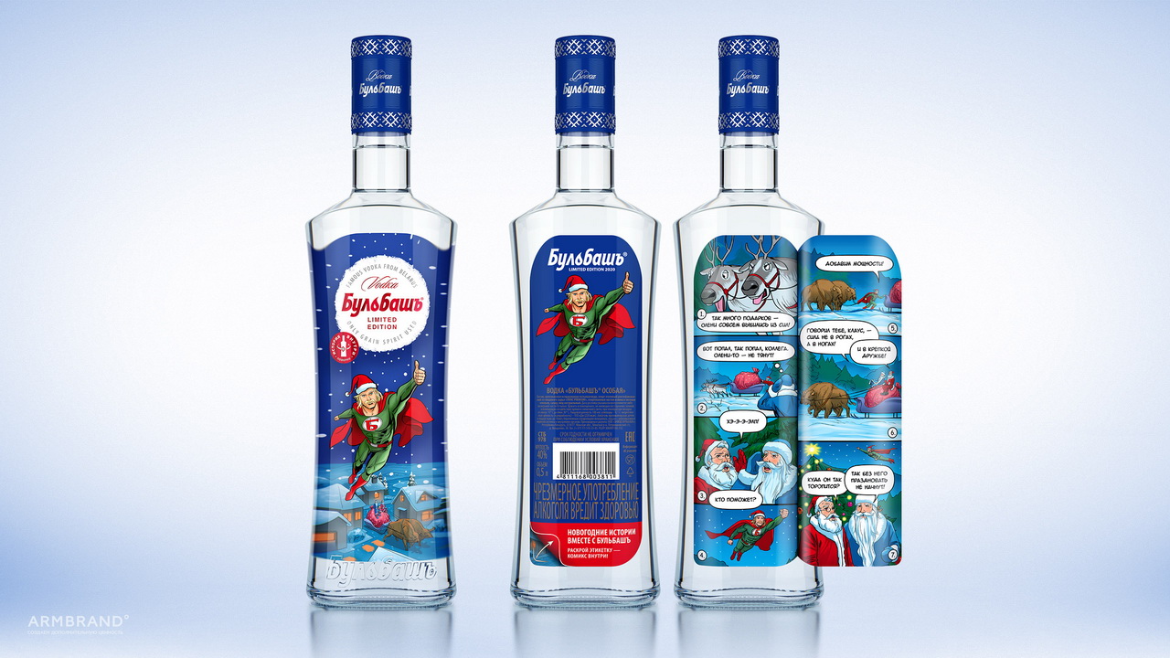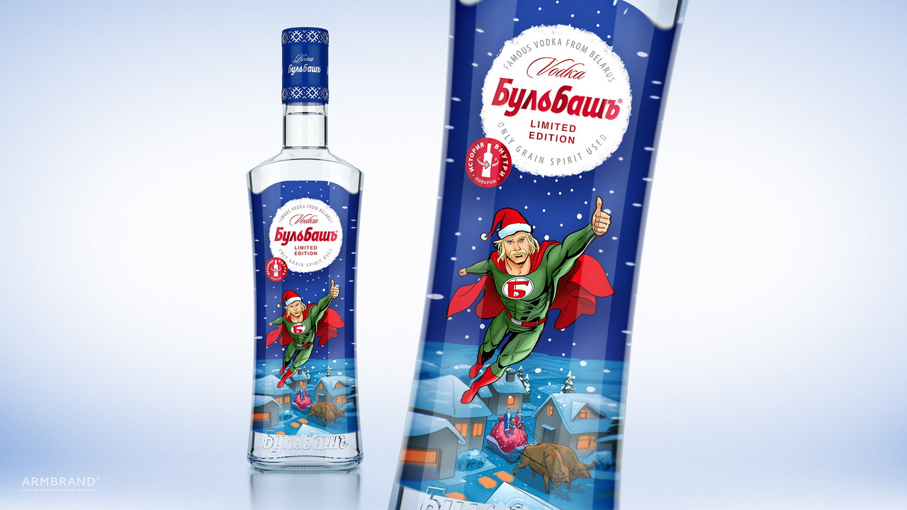 Преображение персонажа БУЛЬБАШЪ в мужественного героя в костюме цветов национального флага оригинально символизирует развитие бренда — при достижении определенных вершин происходит переход в новое качество, и у бренда открываются огромные возможности. Изменился не только персонаж — эта лимитированная серия логично совпадает с появлением обновленной современной бутылки и колпака. Прекрасная возможность рассказать партнерам и потребителям о своем развитии, одновременно поздравляя их с Новым годом!