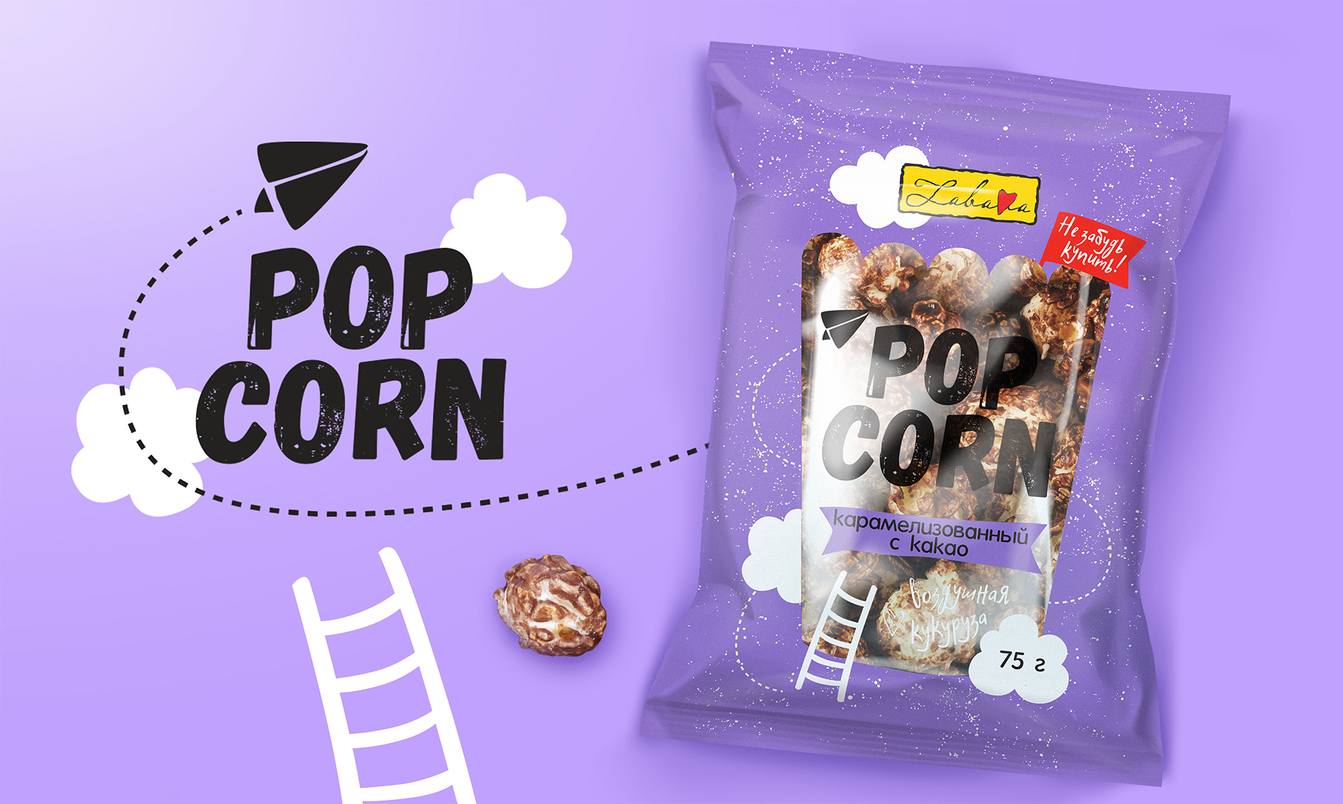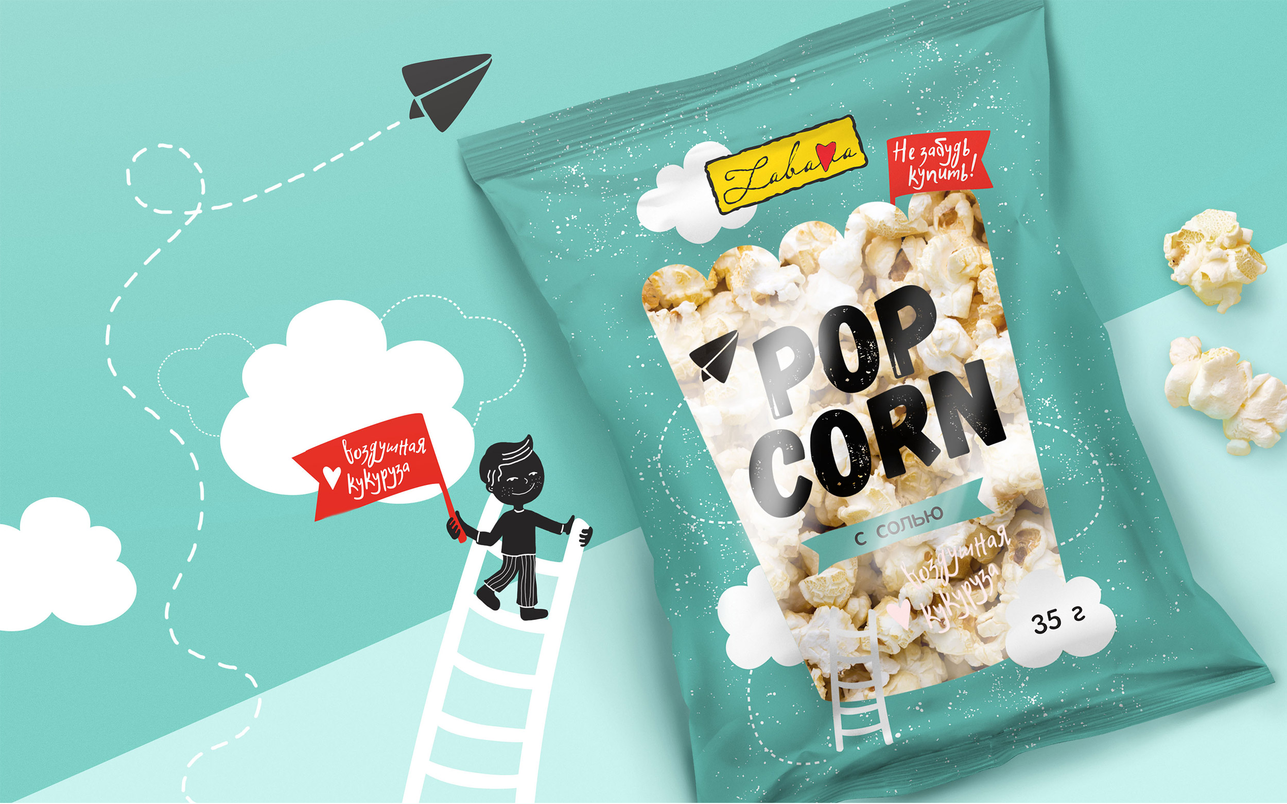 Помимо этого, еще одно очень узнаваемое и отличительное свойство продукта — его воздушная текстура. Чтобы подчеркнуть это, на пачку добавили облака (ведь они даже похожи на попкорн) и меленький бумажный самолетик добавили ещё один символ легкости и беззаботности.