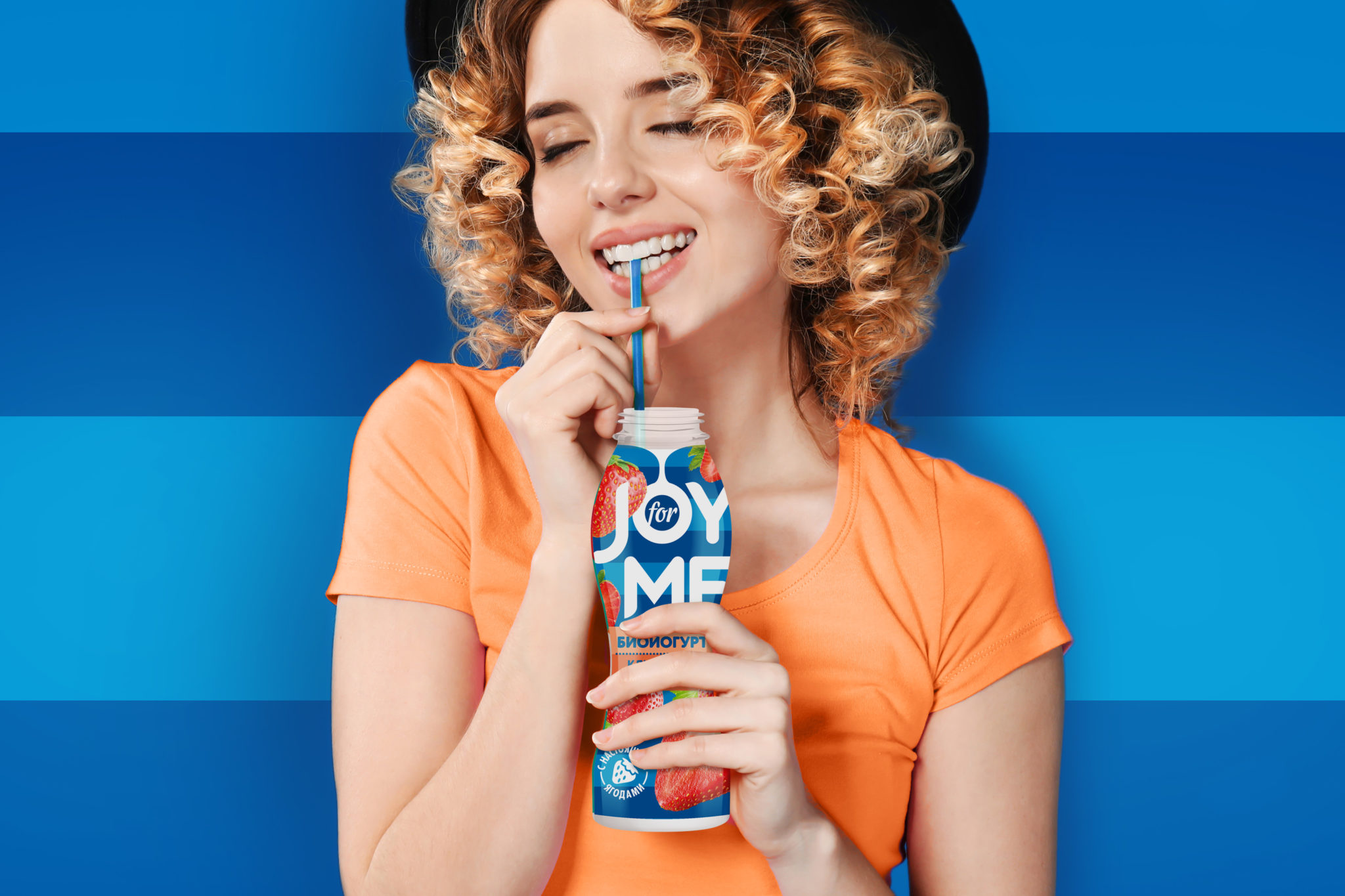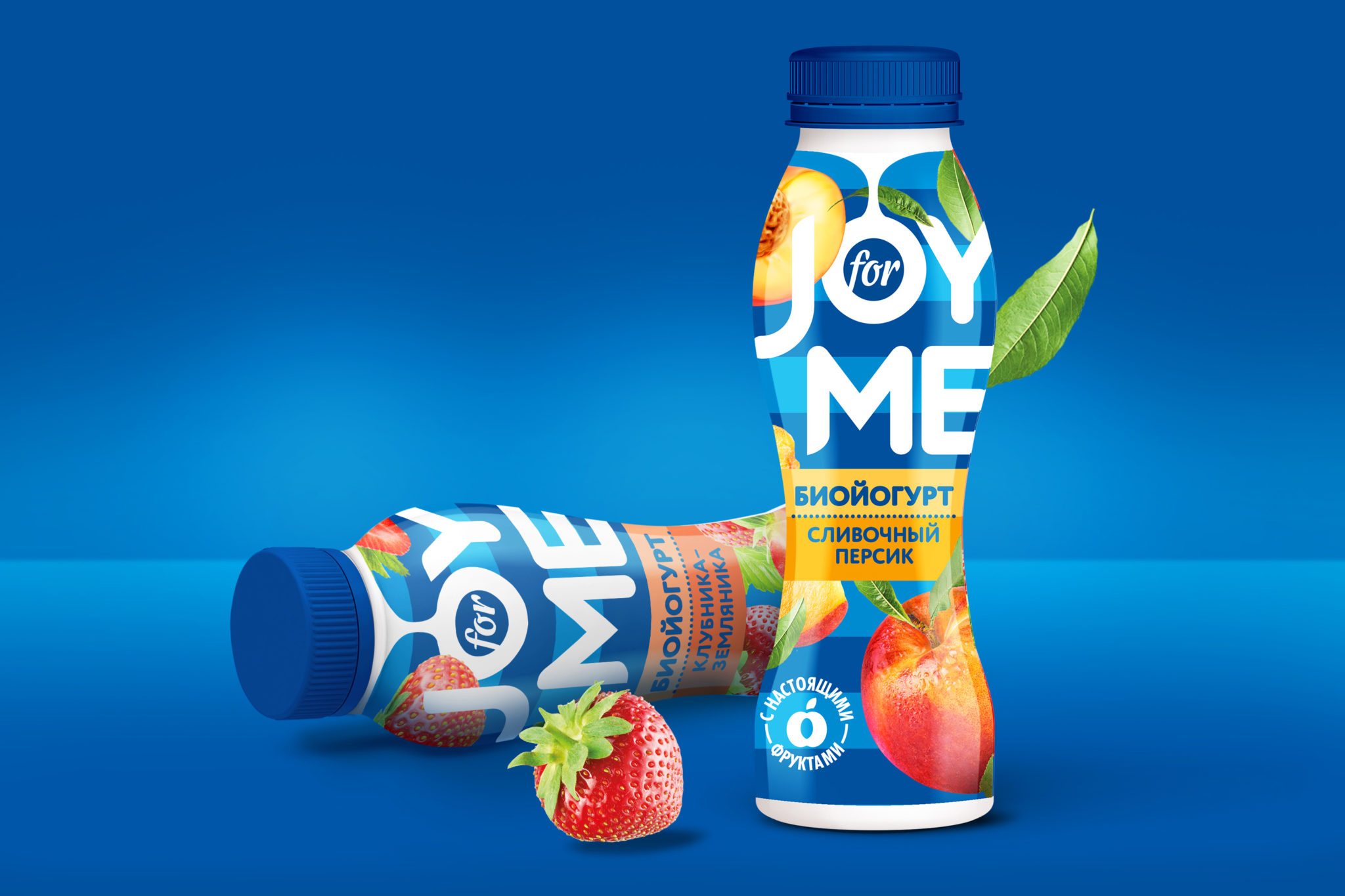 Придуманное специалистами агентства название «Joy for me» символизирует хорошее настроение и самочувствие, фокусирует на удовольствии от вкуса продукта. Яркие цвета, акцентные полоски, аппетитные фрукты — упаковка «Joy for me» получилась модной, интересной и оригинальной. Привычный всем йогурт заиграл новыми красками.