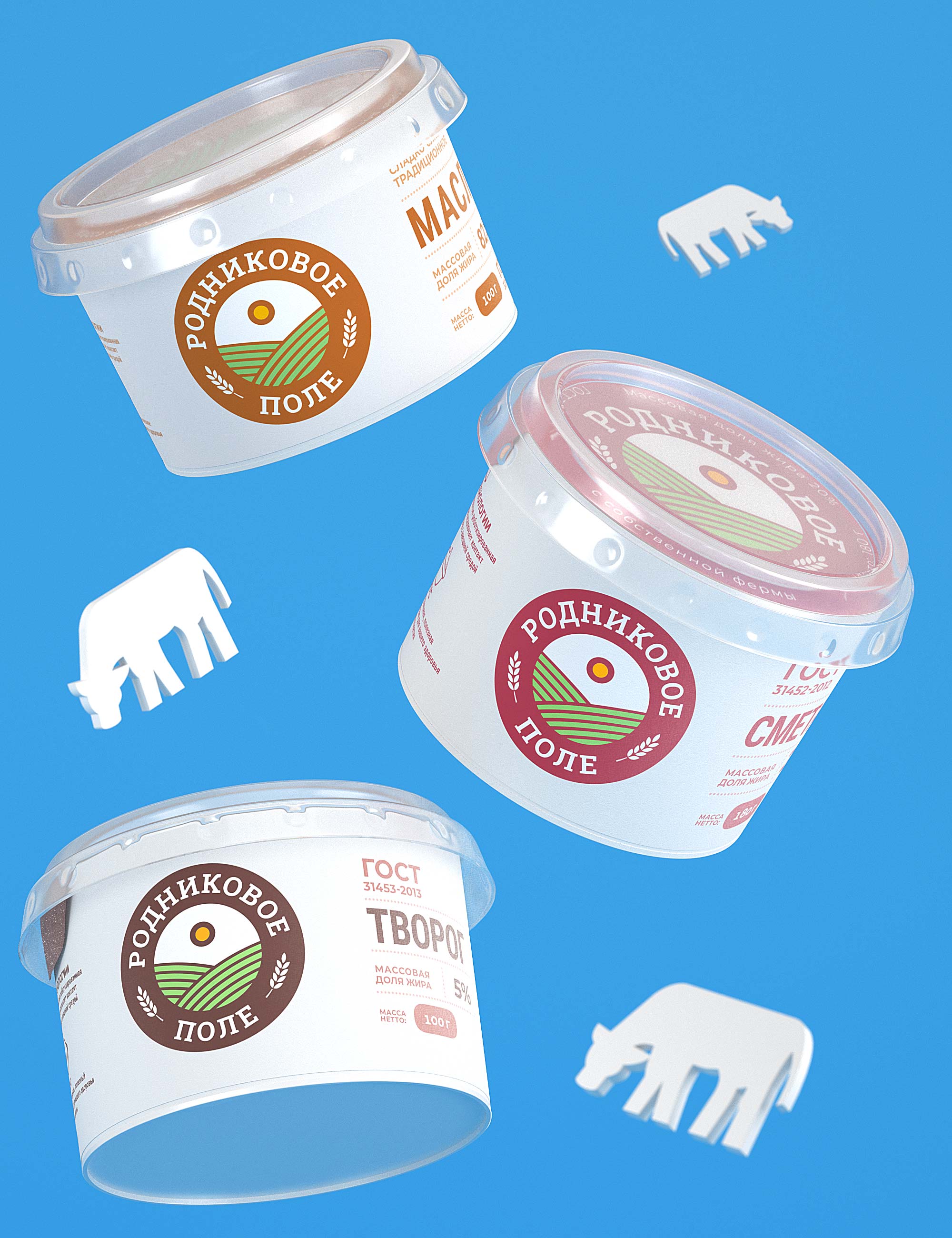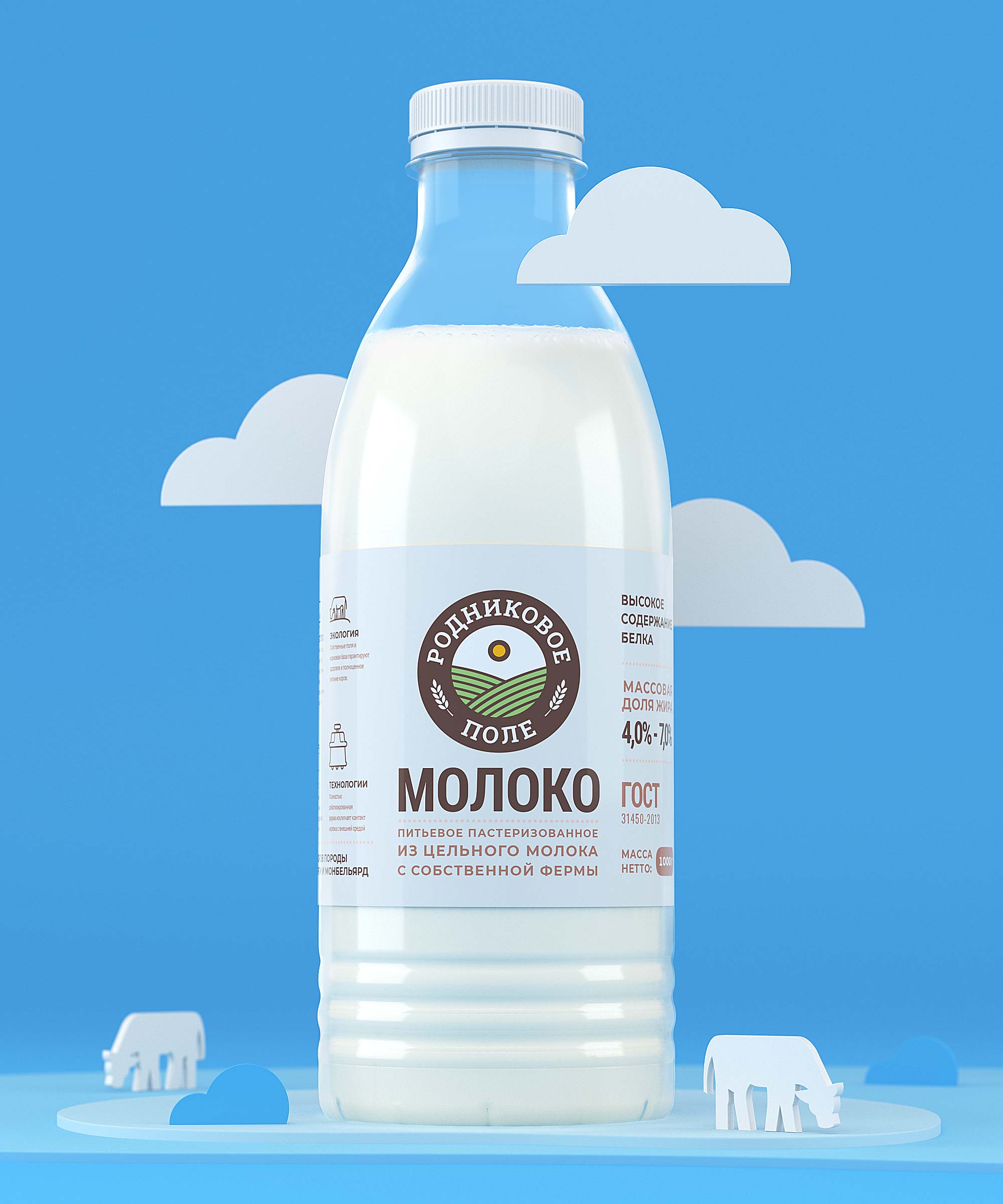 Это современное хозяйство с роботизированной молочной фермой. Поэтому при разработке дизайна упаковки для молочной продукции был сделан акцент на современность, лаконичность и чистоту. Такой подход к дизайну несомненно выделит продукты «Родникового поля» среди огромного количества типичных деревенских пейзажей, которые так «приелись» российскому потребителю.