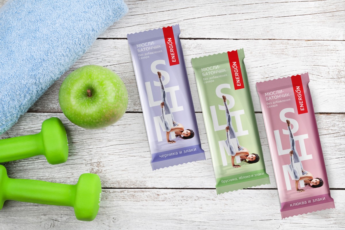 В дизайн-концепции дизайнеры использовали сочетание фотографии и типографики, посчитав его наиболее способным выделить продукт на полке и привлечь внимание целевой аудитории. Композиция, где соединены изображение занимающейся йогой девушки и название батончика, обладает движением и настроением, передает тему гибкости и стройности.