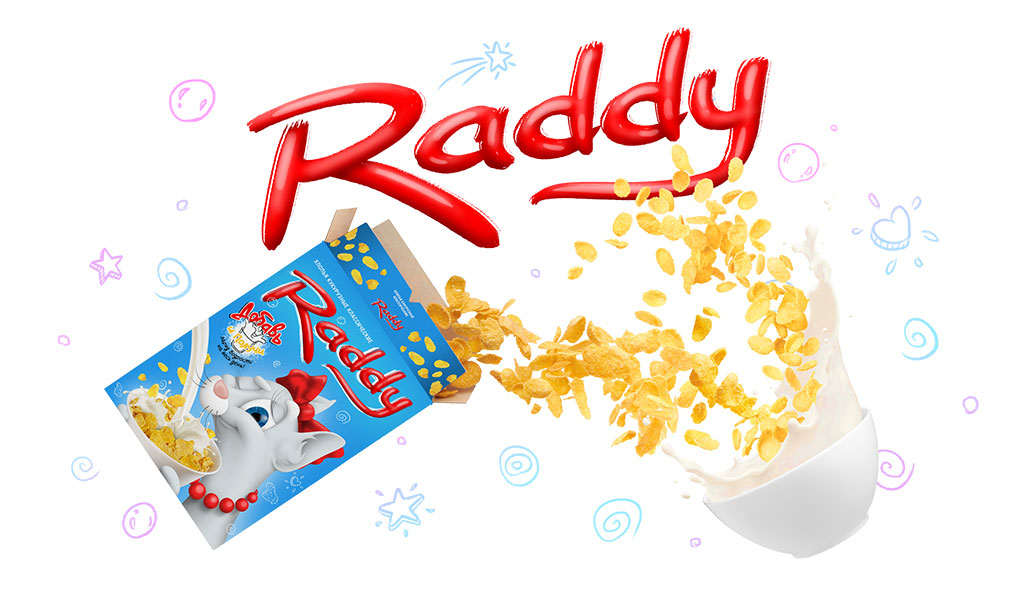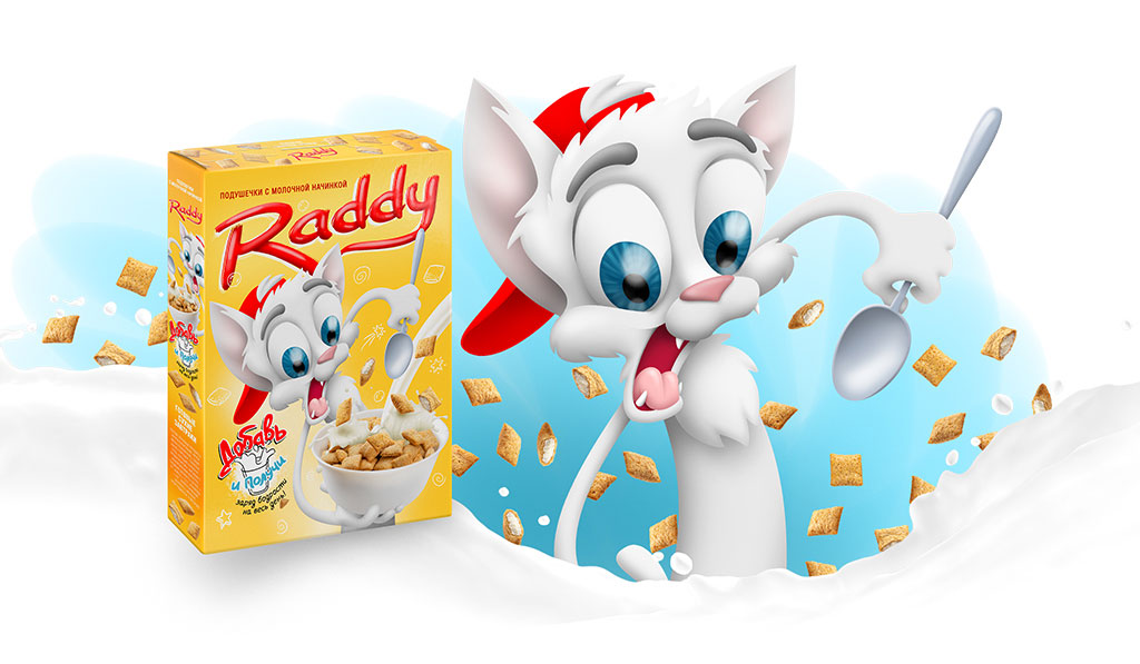 Яркие образы семьи Raddy легко запоминаются и концентрируют внимание на аппетитности продукта. Очаровательное семейство кошачьих мультифункционально и линейка продуктов может легко диверсифицироваться. Разработка персонажей началась с проработки образа каждого героя. Трудолюбивая и заботливая мама предлагает каждому полакомиться вкусным завтраком. Сообразительный и хулиганистый сынок, как всегда, превращает завтрак в игру. Находчивый и смелый папа с упоением заботится о своей семье. Глубокая прорисовка каждого персонажа превратила их в полноценных бренд-героев.