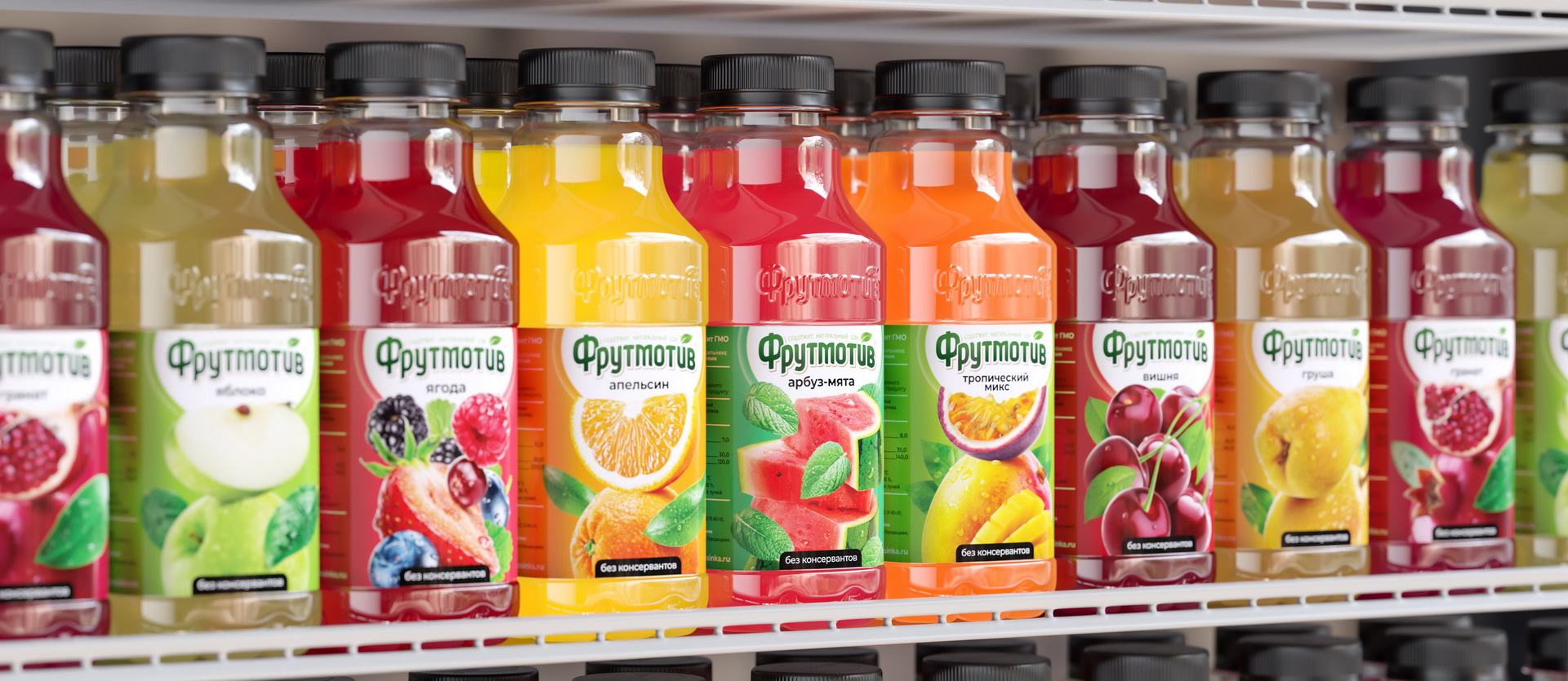 В студии была проведена масштабная работа по плановому обновлению визуального образа бренда сокосодержащих напитков «Фрутмотив», созданного командой дизайнеров для одного из флагманов рынка безалкогольной продукции Компании Росинка.