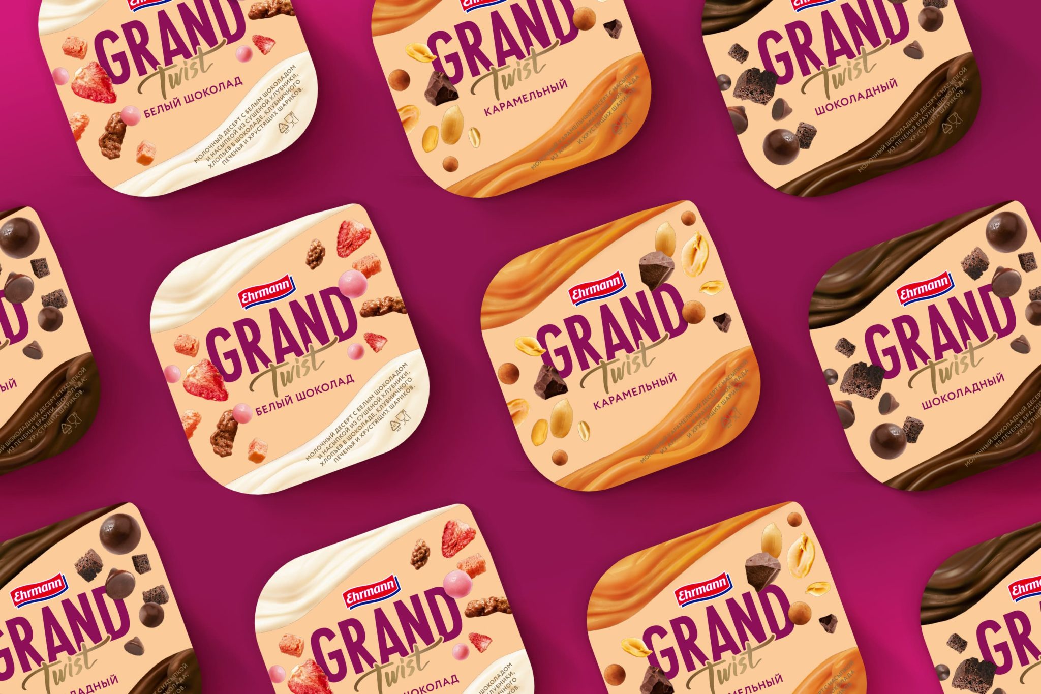 Компания Ehrmann будучи трендсеттером в мире йогуртов и постоянно добавляя новинки в свои линейки, выпустила еще один бестселлер в линейке Grand Dessert для которого в Getbrand разработали дизайн упаковки. Grand Twist — это сочетание нежного пудинга с оригинальными и яркими насыпками. Продукт упакован в уникальный двухсекционный стаканчик. В малом отделении находится насыпка, а в большом — пудинг.