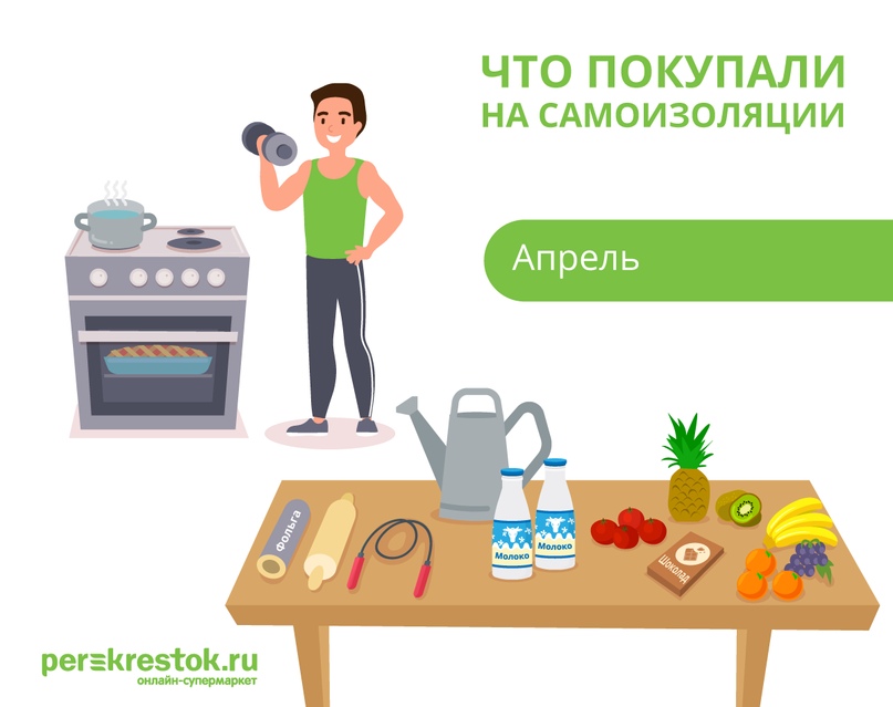 Вместе с этим в этот период спрос сместился в сторону товаров для различных занятий дома. Покупатели стали больше готовить самостоятельно — продажи товаров для выпечки выросли в апреле в 26 раз относительно середины марта. Высоким спросом пользовались формы для выпечки и запекания, а также скалки и пищевая фольга. Помимо готовки москвичи и петербуржцы стали уделять внимание фитнесу: продажи спортивного инвентаря увеличились в 36 раз. В частности, клиенты Perekrestok.ru приобретали эспандеры, скакалки, ленты для пилатеса и коврики для йоги.