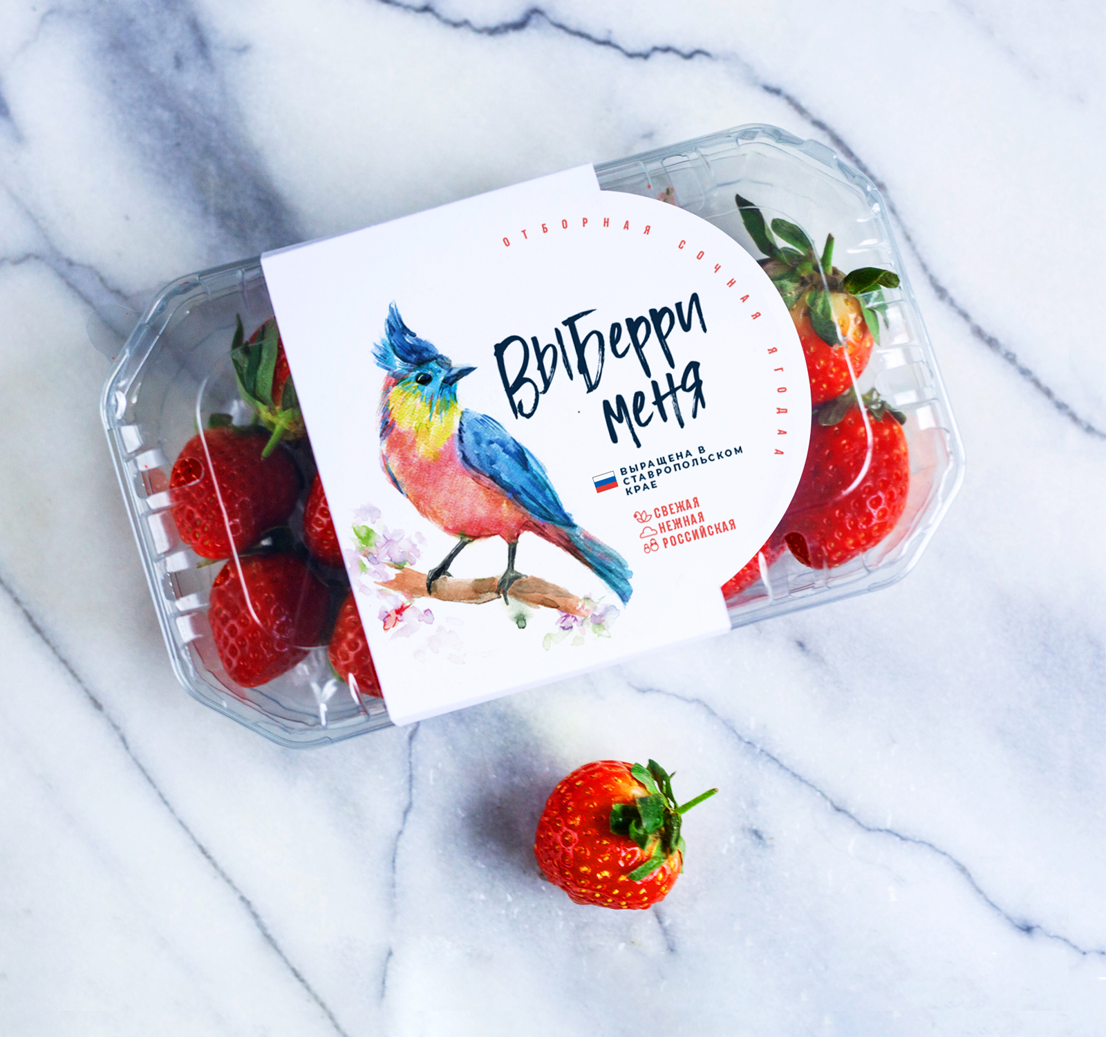 Иллюстрация только усиливает это впечатление. Озорная акварельная птичка, выполненная в ярких, насыщенных тонах, создаёт ощущение лёгкости и навевает на мысли о маленьком празднике, который каждый из нас может устроить себе (или в подарок) прямо здесь и сейчас при помощи упаковки ароматных, сочных и нежных ягод «только-только с грядки».