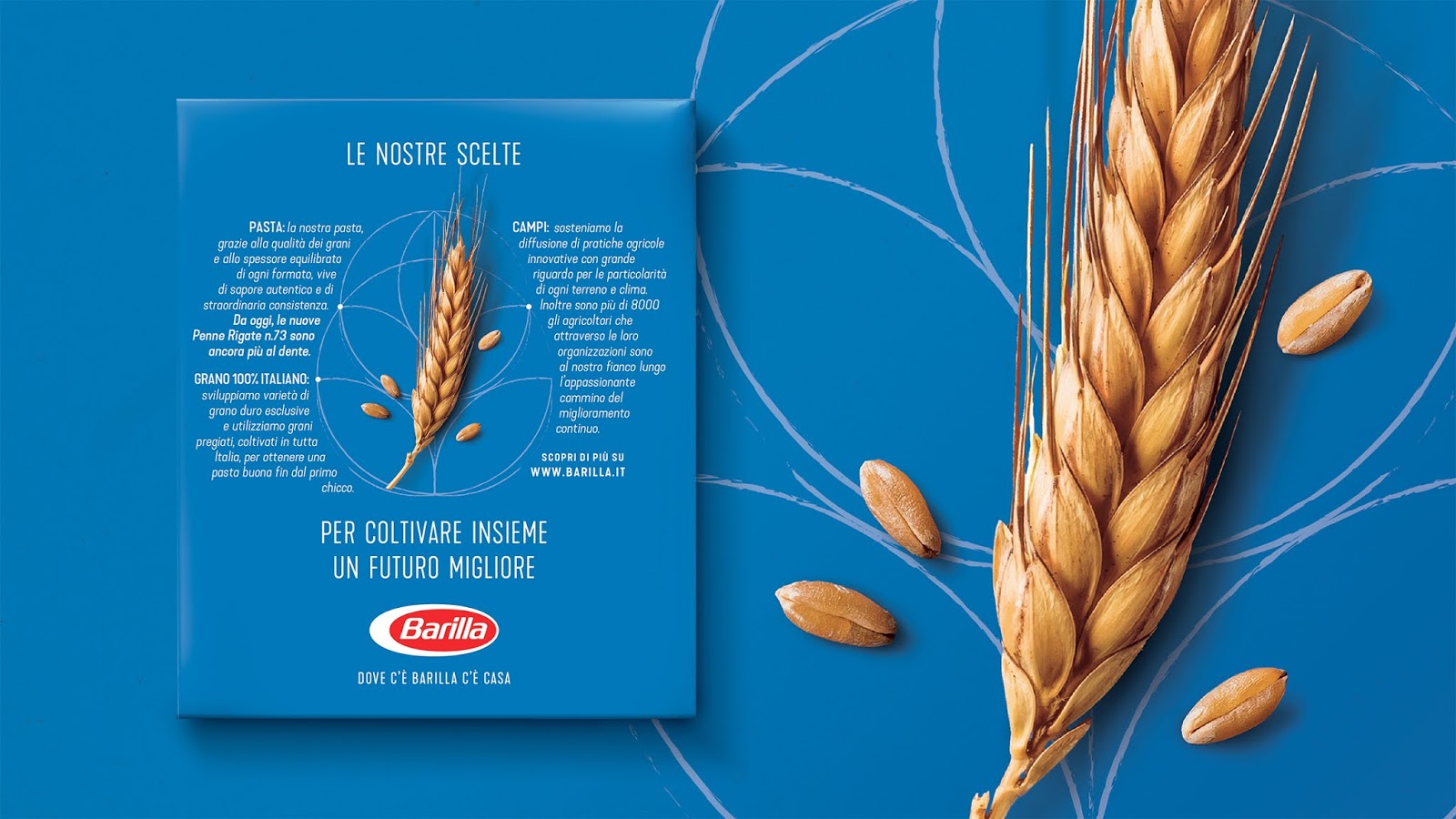 Как будто в фильме, растянувшемся на 150 лет, объединяющим элементом дизайна становится чистый голубой цвет итальянского небо, под которым и происходят все события в жизни компании. Он объединяет всё: возделываемые поля пшеницы, производство пасты и подачу её на столы тысяч семей.