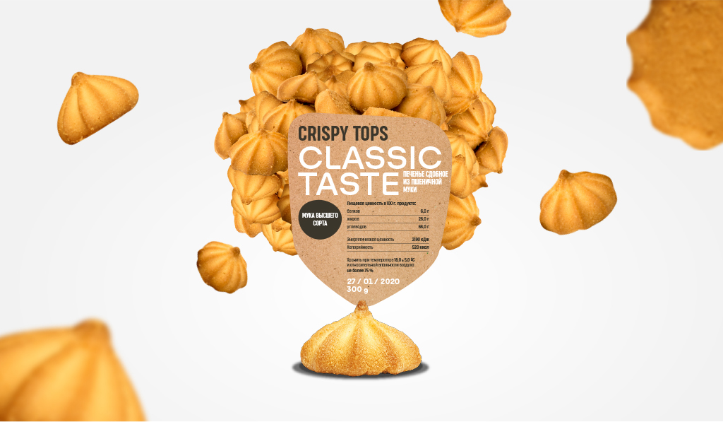 Концепция дизайна упаковки для сдобного печенья в сегменте премиум получилась не статичной в своей визуализации. Один взгляд на key-visual упаковки создает ощущения мелкого подрагивания печенек и чувство, будто они магнитом притянулись в центр фейса упаковки.