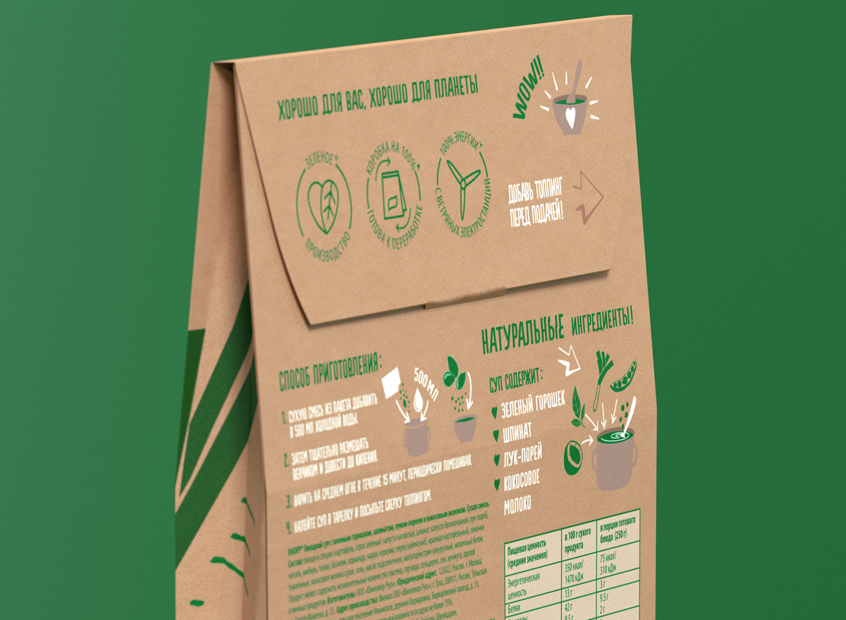 Во всех пяти видах упаковки есть прозрачное вырубное окно, в котором виден сам продукт, что повышает доверие потребителя. Командой была учтена важность размещения полной информации о продукте на лицевой и оборотной стороне упаковки. Дизайнеры сделали акцент на изображении инфографики, которая показывает количество порций, время приготовления супа и его состав. Использование именно этого атрибута современной упаковки обусловлено тем, что у людей отсутствует время на долгий поиск информации о товаре на полке — потребитель хочет получить всю информацию сразу в понятном виде.