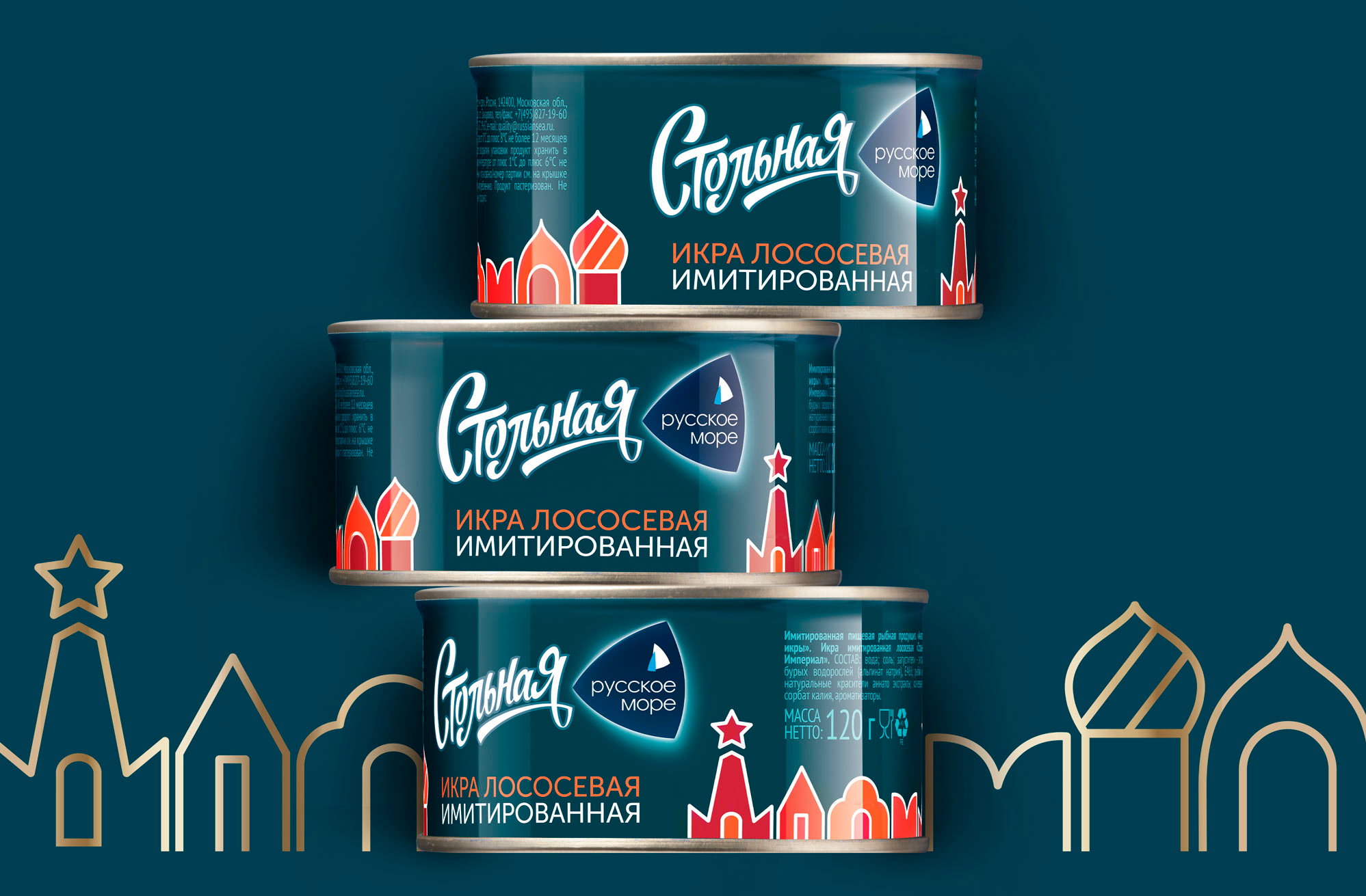 Главным элементом бренд-айдентики нового дизайна стали узнаваемые столичные образы: силуэты зданий, башенки и зубцы московского Кремля, крыши домов и маковки церквей. Они же одновременно работают дифференциатором вкуса: красная гамма — для лососевой икры, зелёная — для осетровой.