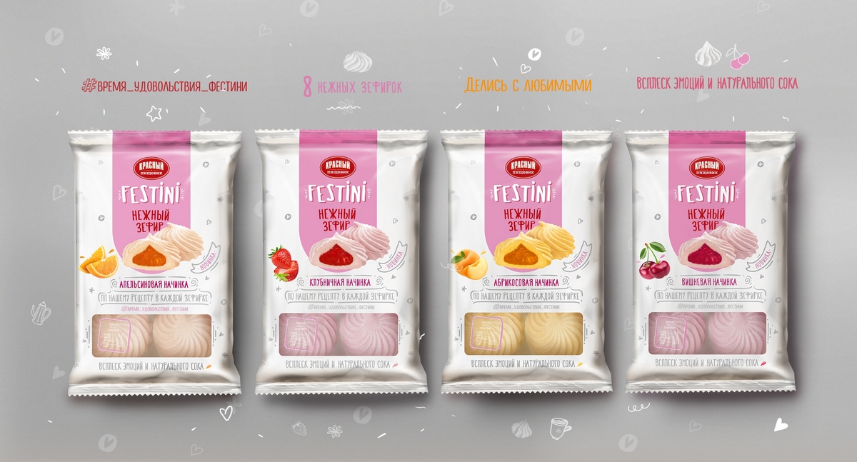 Бренд Festini появился на полках в 2018 году как молодежный продукт и в продуктовой линейке выделялся крафтовым оформлением и яркими нестандартными вкусами, которых нет в других видах зефира производителя.