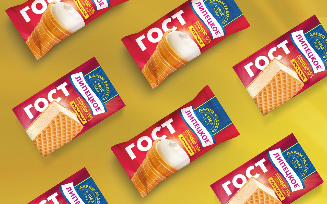 Была усилена зона производителя: не просто ГОСТ, а «ЛИПЕЦКОЕ» > ГОСТ > 1962 год. Подчеркнуто, что это «пломбир с историей», сохранивший оригинальные рецептуры и производящийся из качественного сырья. Выделена принадлежность к бренду производителя. Контрастные цвета упаковки усилили заметность продукта на полке.