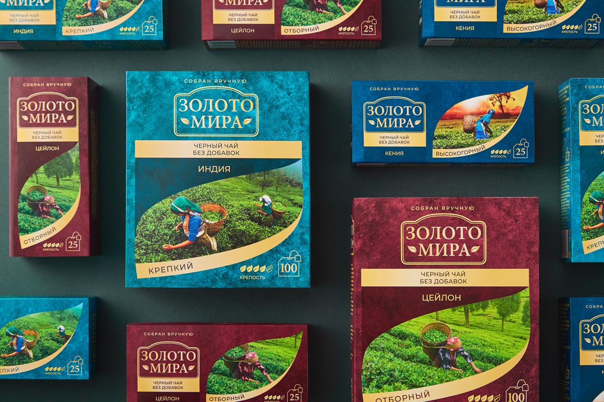 Нейм «Золото мира» презентует чай как большую ценность и отсылает к процессу производства продукта: флеш с двумя-тремя листами и стеблем называют сортовым или «золотым».