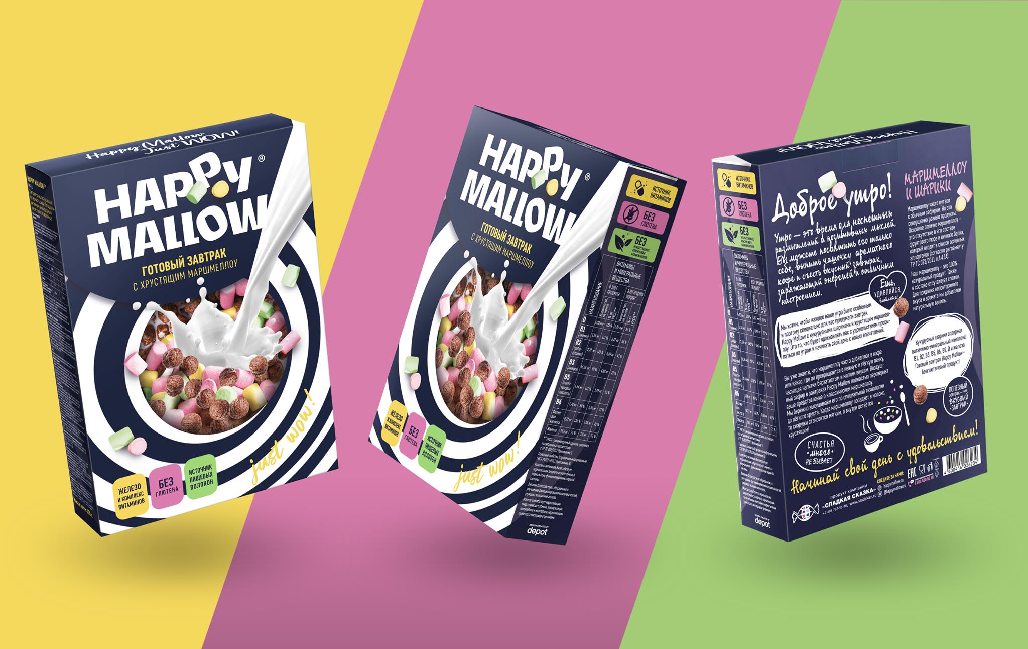 Happy Mallow — новый продукт, не имеющий аналогов на российском рынке. В агентстве Depot разработали дизайн упаковки и создали слоган для этого необычного сочетания кукурузных шариков и хрустящего маршмеллоу. Потребитель привык видеть на полке с сухими завтраками довольно ограниченный набор продуктов. Хлопья в виде шариков, хлопья в виде колечек, хлопья в виде букв, хлопья в виде хлопьев… Все это человек заливает молоком и завтракает изо дня в день.