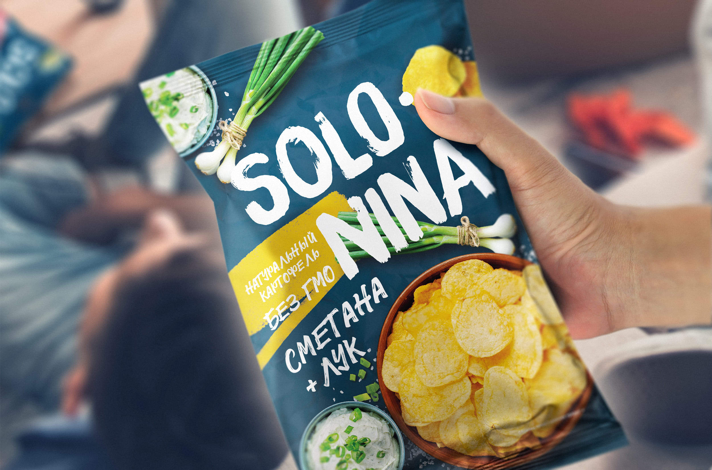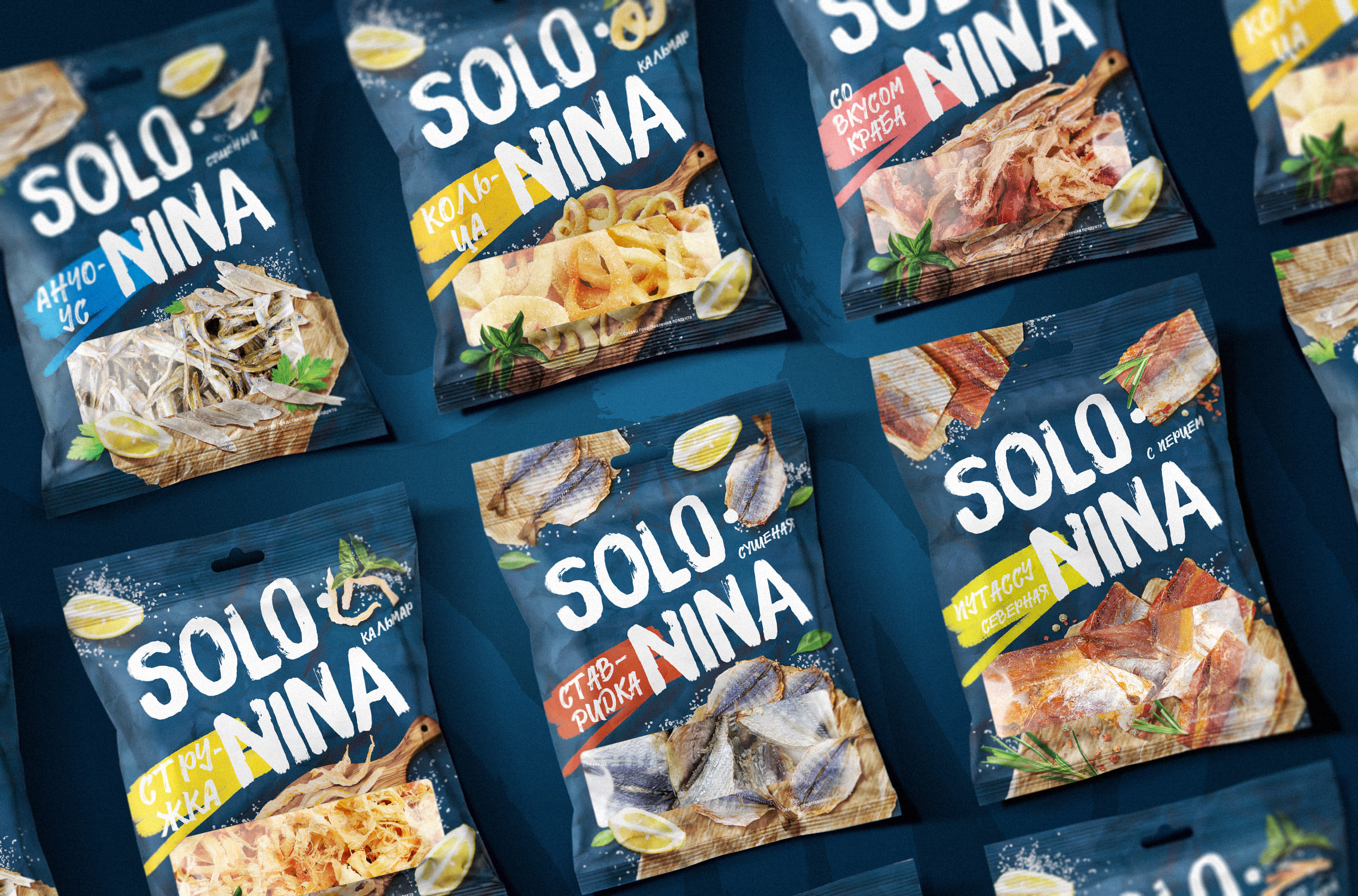 Специалисты агентства разработали нейминг для линейки пивных снеков под названием SOLONINA, концепт и дизайн упаковки, а также адаптировали его на 80 SKU.