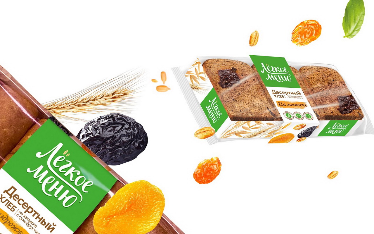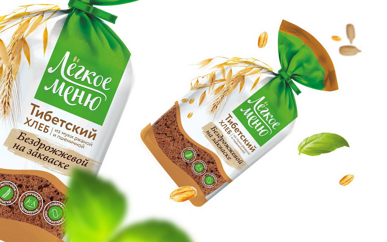 Превалирующий белый цвет дает объем и создает ощущение легкости и воздуха. Колоски — отсылка к составу. Большой хорошо запоминаемый логотип с интересным обыгрыванием буквы «ё» в названии — отсылка к натуральности и щедроте самой природы, которая и подарила нам хлеб.