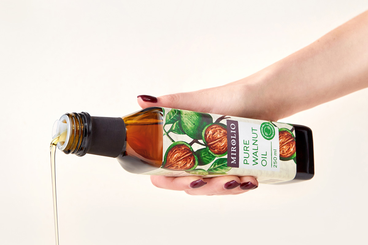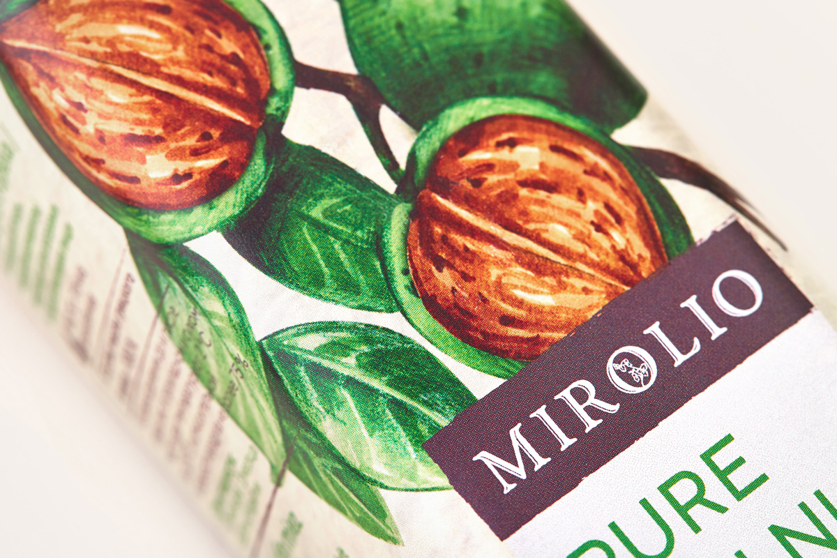 Четкое зонирование помогает идентификации ТМ и выбору SKU. А шрифтовой логотип Mirolio гармонично выглядит на этикетке с новым дизайном.