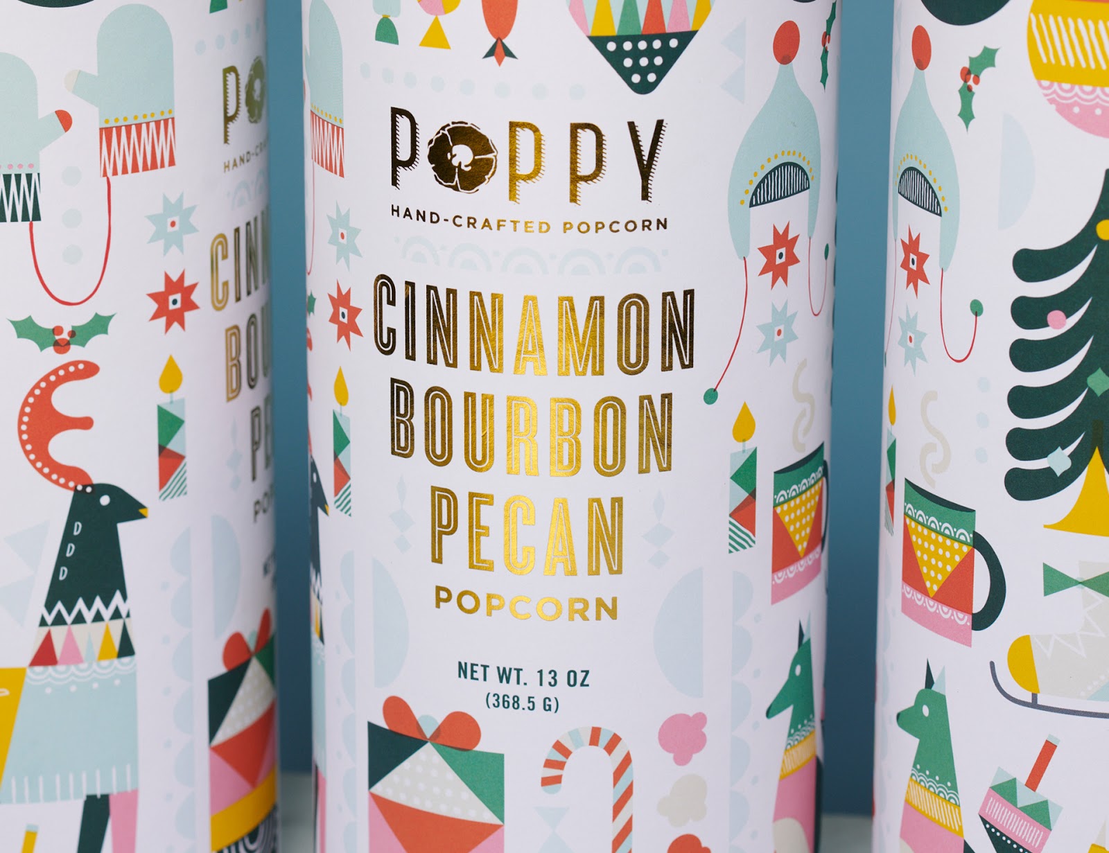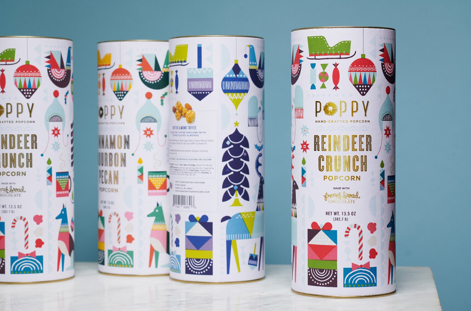 Праздничный дизайн 2020 года для Poppy Handcrafted Popcorn основан на современных цветовых палитрах и иллюстрациях, принятых в скандинавских странах. Начиная с оленей и лис и заканчивая орнаментами и варежками, уникальные иллюстрации от Atlas Branding обрамляют картонные тубы с продуктом, подобно праздничному тотему, рассказывающему красочную, яркую и торжественную историю праздника.
