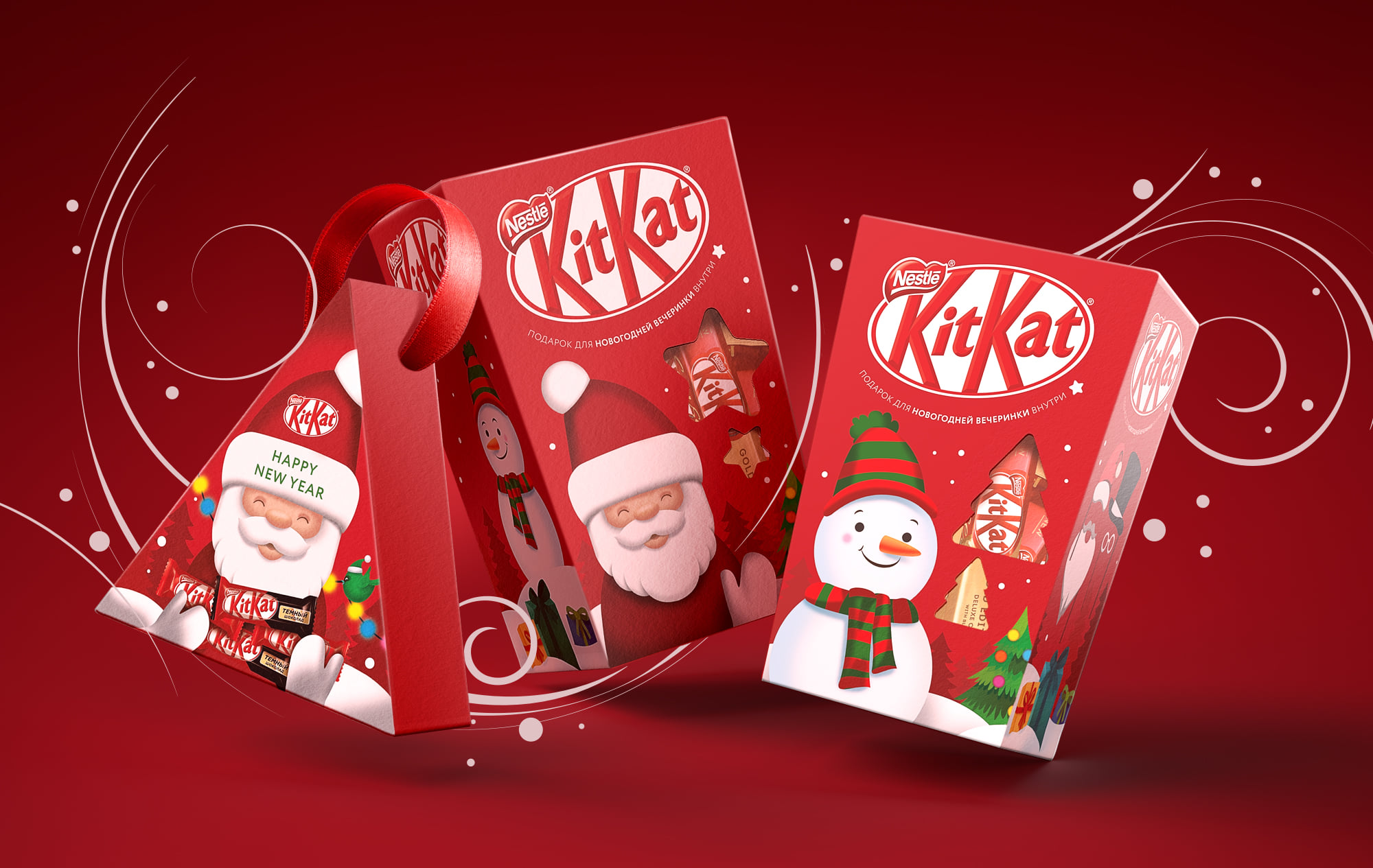 Упаковка различных форм — треугольник, напоминающий по форме ёлку, Party Box и даже упаковка в форме настоящей конфеты. Центральные герои иллюстраций на упаковке — Дед Мороз и Снеговик. Дополняют тему праздника коробки с подарками, украшенная ёлка и яркая гирлянда.