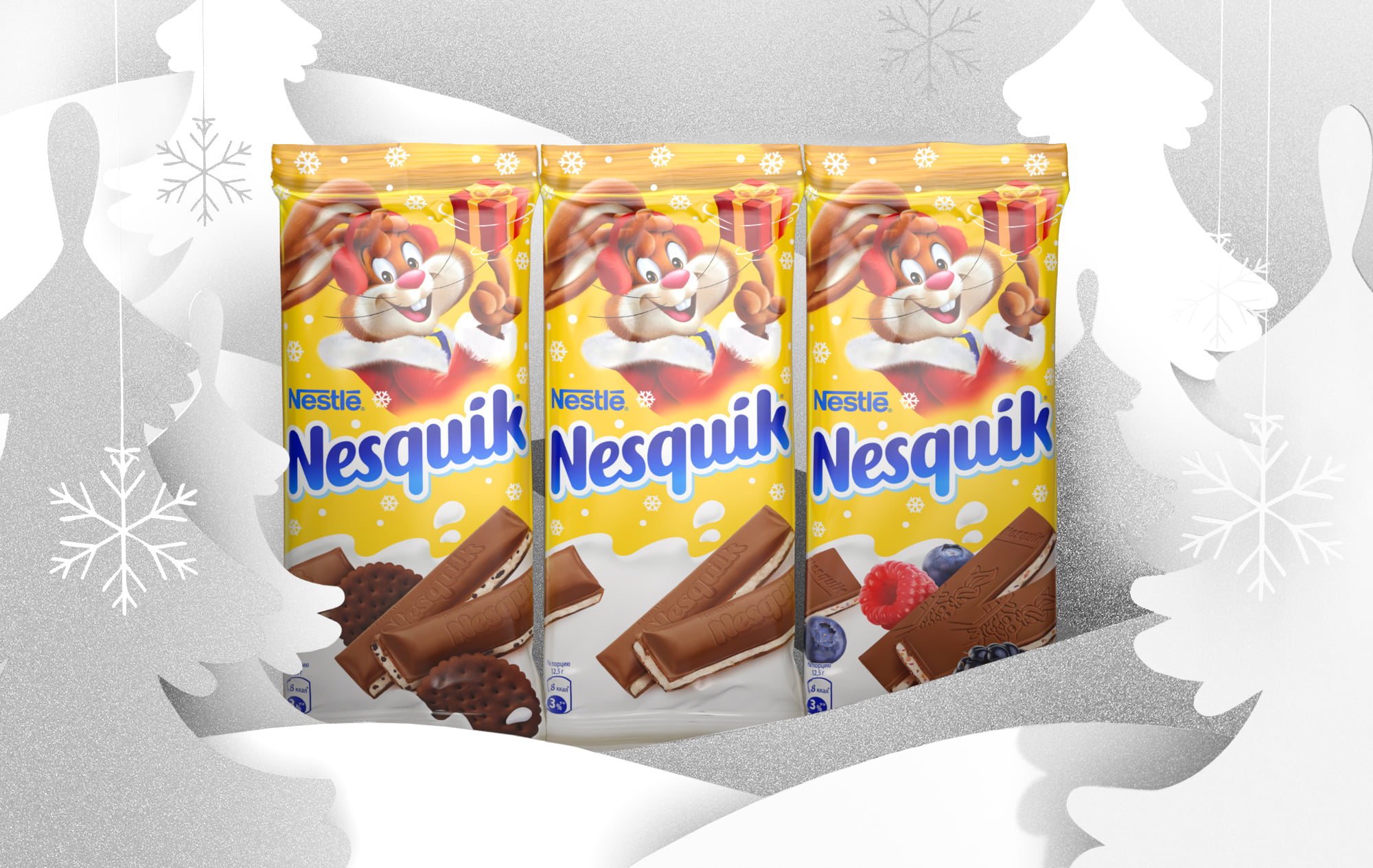Россыпь снежинок передаёт атмосферу волшебства, зимы и снега, по которому скользят сани с главным волшебником года. Кролик Квики готов ко встрече Нового года!
