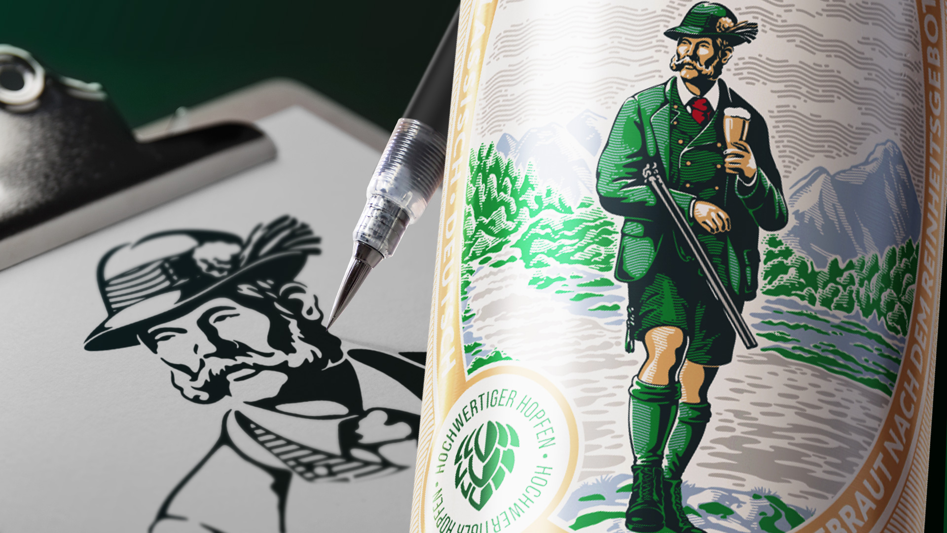 На достижение цели работает всё — название и слоган подчёркивают происхождение продукта, в дизайне использован традиционный образ баварского охотника в егерской тирольской шляпе, выполненный в гравюрном стиле.