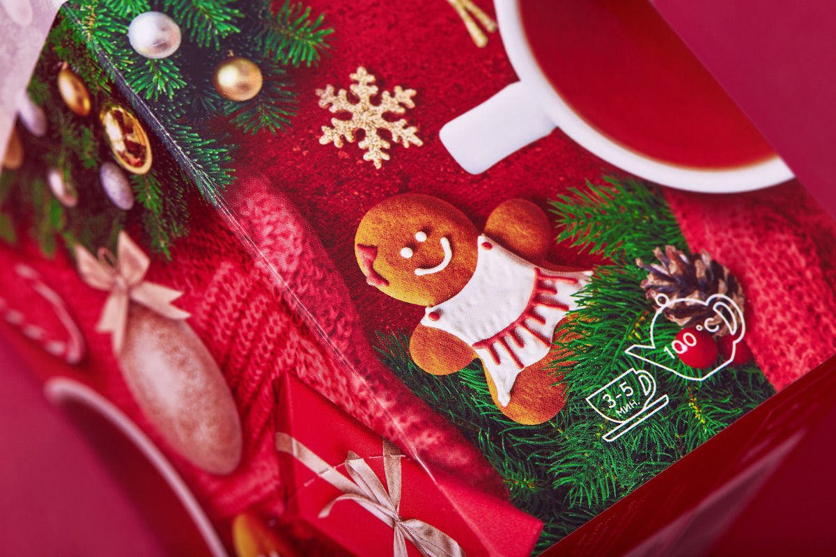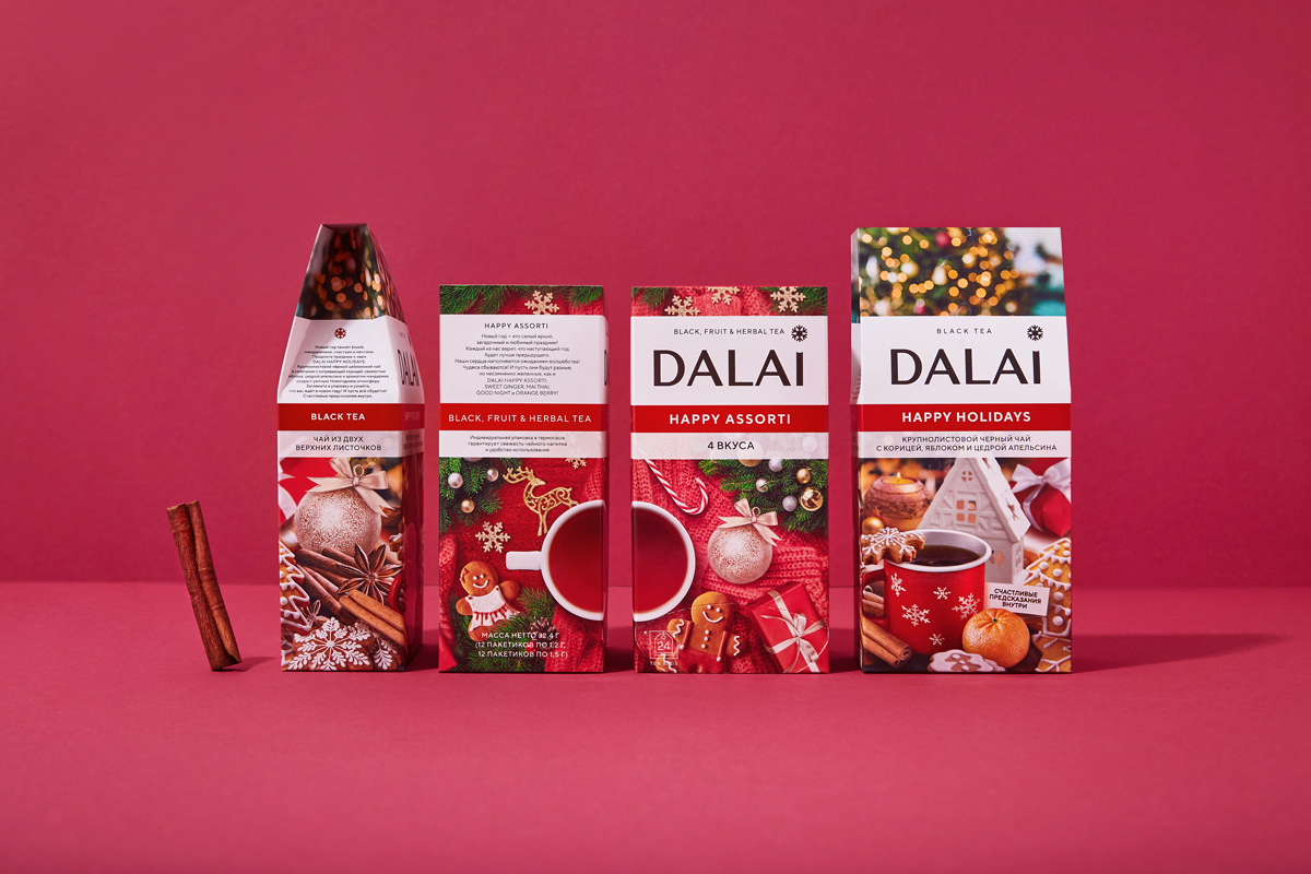 Клиент выпустил лимитированную серию чая DALAI — Happy. Следовало разработать рождественский дизайн упаковки для двух позиций — Holidays и Assorti.