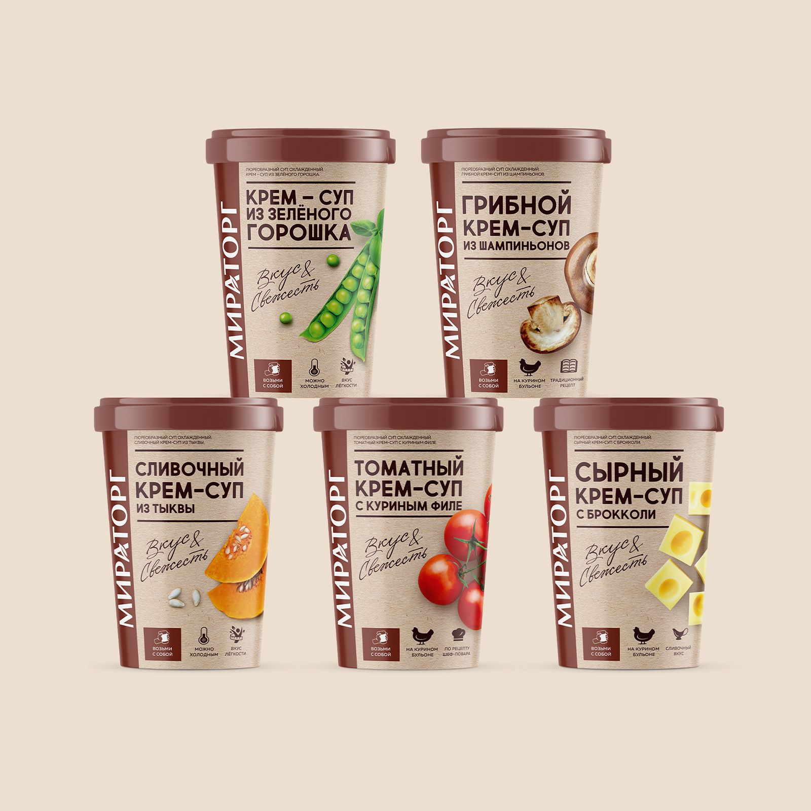 В дизайне упаковки решено было выделить европейские тенденции ready food. Сделать акцент на натуральности и свежести ингредиентов, заострить внимание на вкусе и скорости употребления продукта.
