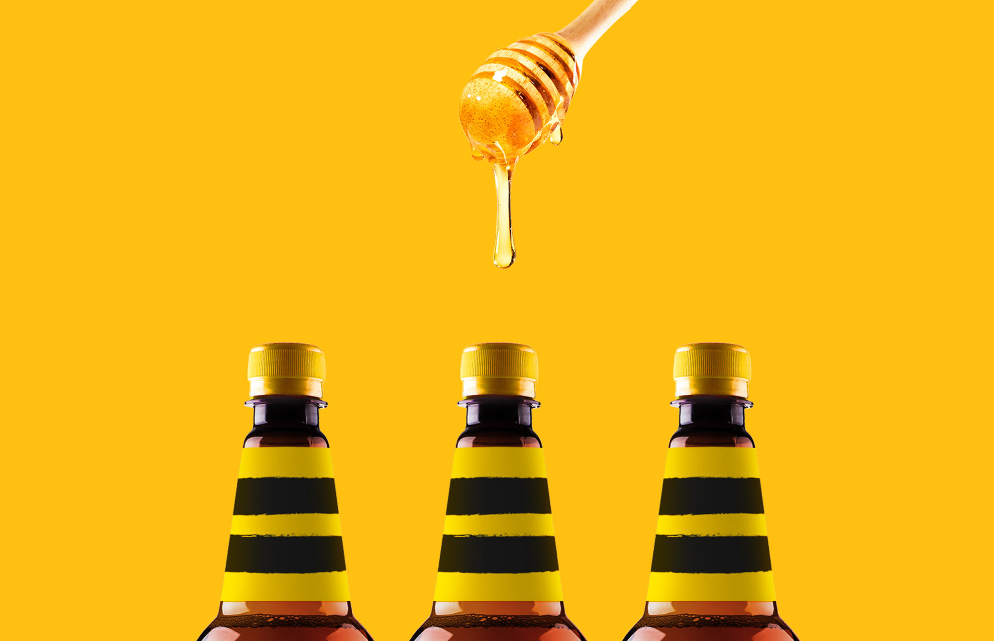 Имитирующие раскрас пчелы желто-черные полоски на кольеретке в верхней части бутылки за счет цветового акцента еще больше выделяют продукт на фоне остальных конкурентов.