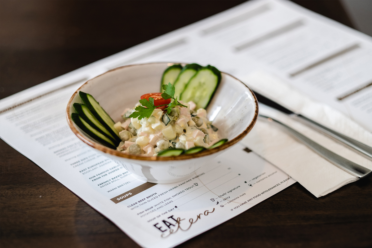 Идею места, где можно найти пищу для ума и сердца, развивает нейм. Фантазийное название Eat Cetera, обыгрывает известное выражение «et cetera», или etc. (с лат. «и так далее»», «и тому подобное»).