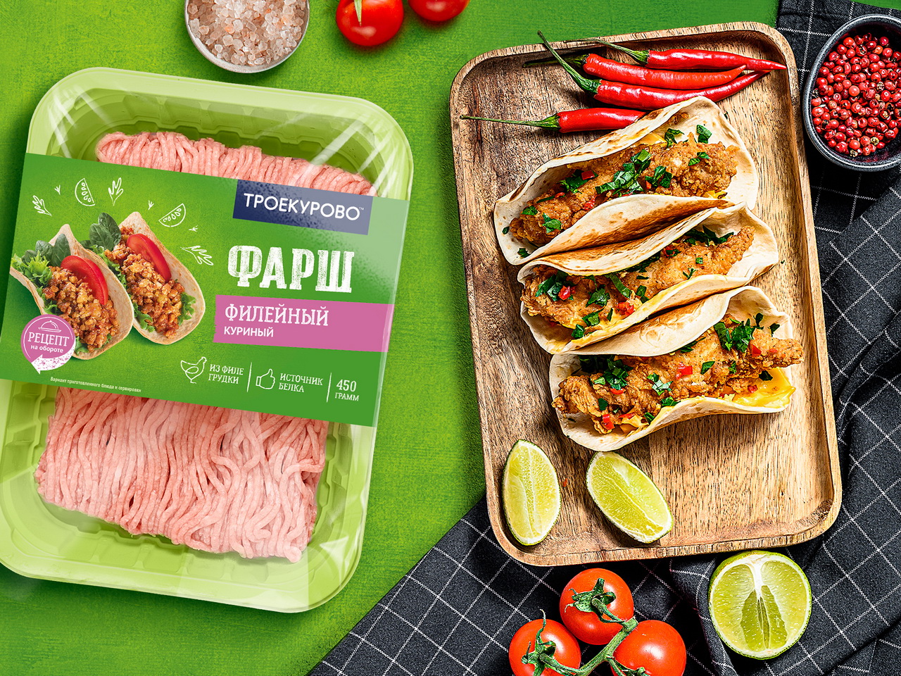 Основная задача редизайна — обновить восприятие категории куриных фаршев бренда «Троекурово», транслировать важные ценности бренда — натуральность, экологичность и свежесть.