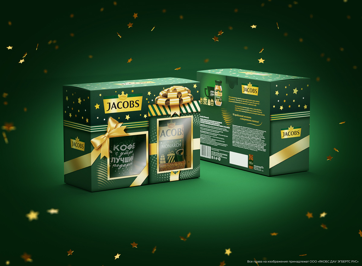 Дизайн набора разработан в рамках гайдбука с использованием двух фирменных цветов, зеленого и золотого. Верхний левый угол украшает крупный брендинг — логотип Jacobs. Лента и бантики, изображенные на коробочке, ассоциируются с подарками, а звезды на фоне создают атмосферу праздника. Благодаря крупной вырубке потребитель может увидеть содержимое набора, тем самым повышается доверие к продукту.