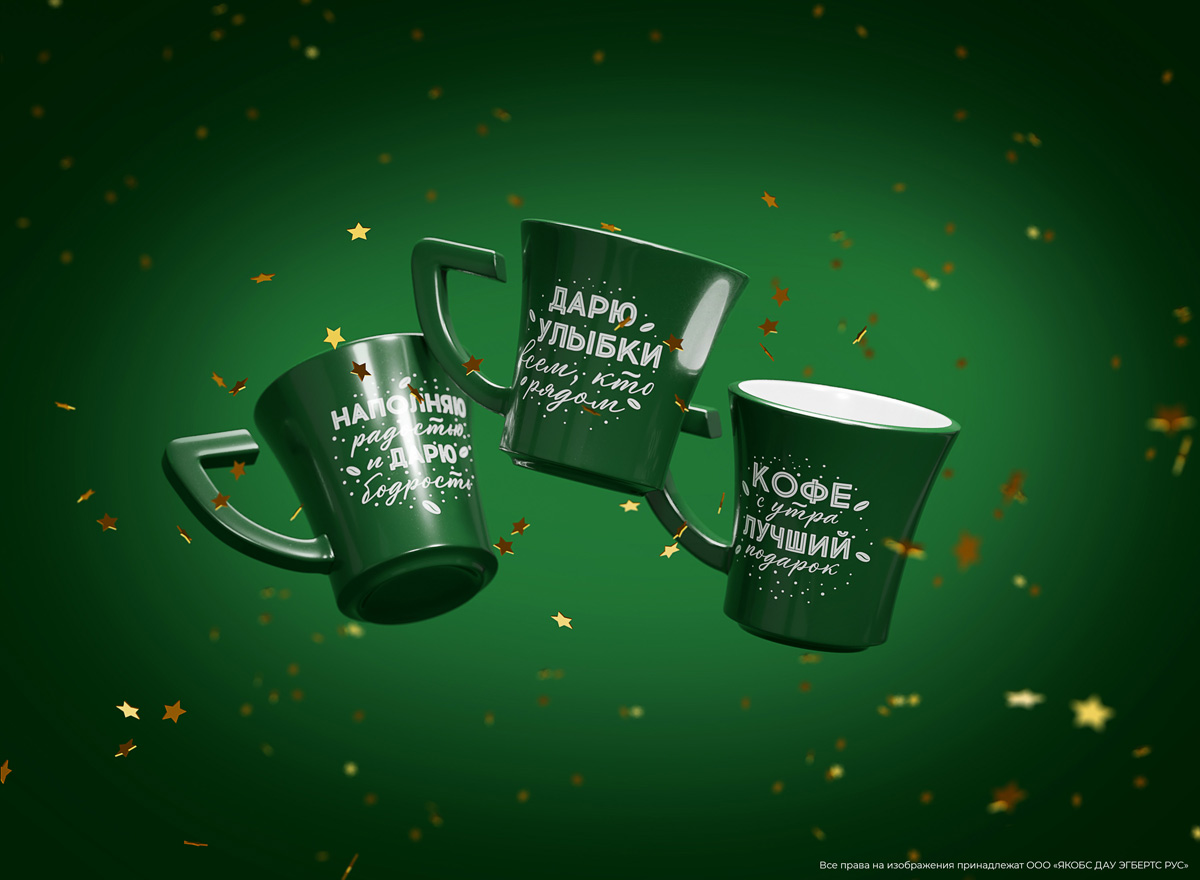 Бренд-команда обратила внимание, что одна коробка состоит из двух отличных подарков: чашки и самого продукта — кофе. Отталкиваясь от этого, креативщики придумали концепцию с изображениями двух разных подарков так, как будто две коробочки стоят вместе.