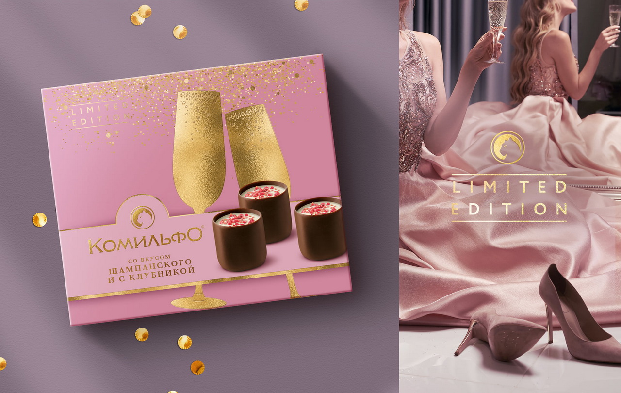 Упаковка нежно-розового цвета, а в золотистых бокалах и в пространстве вокруг них искрятся брызги шампанского.