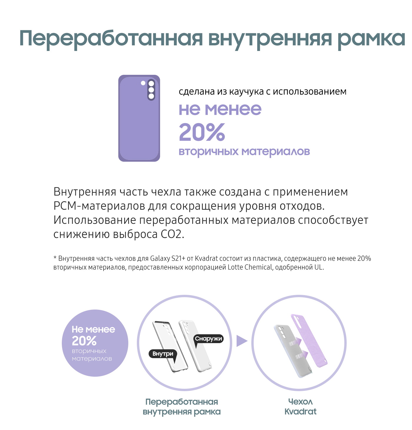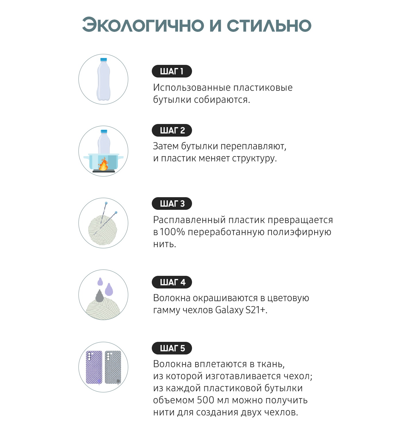 В инфографике вы найдете подробности о новейших стильных и экологически чистых чехлах для телефонов Samsung, доступных в двух эксклюзивных оттенках: фиолетовом и мятно-сером.
