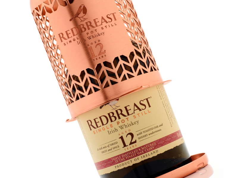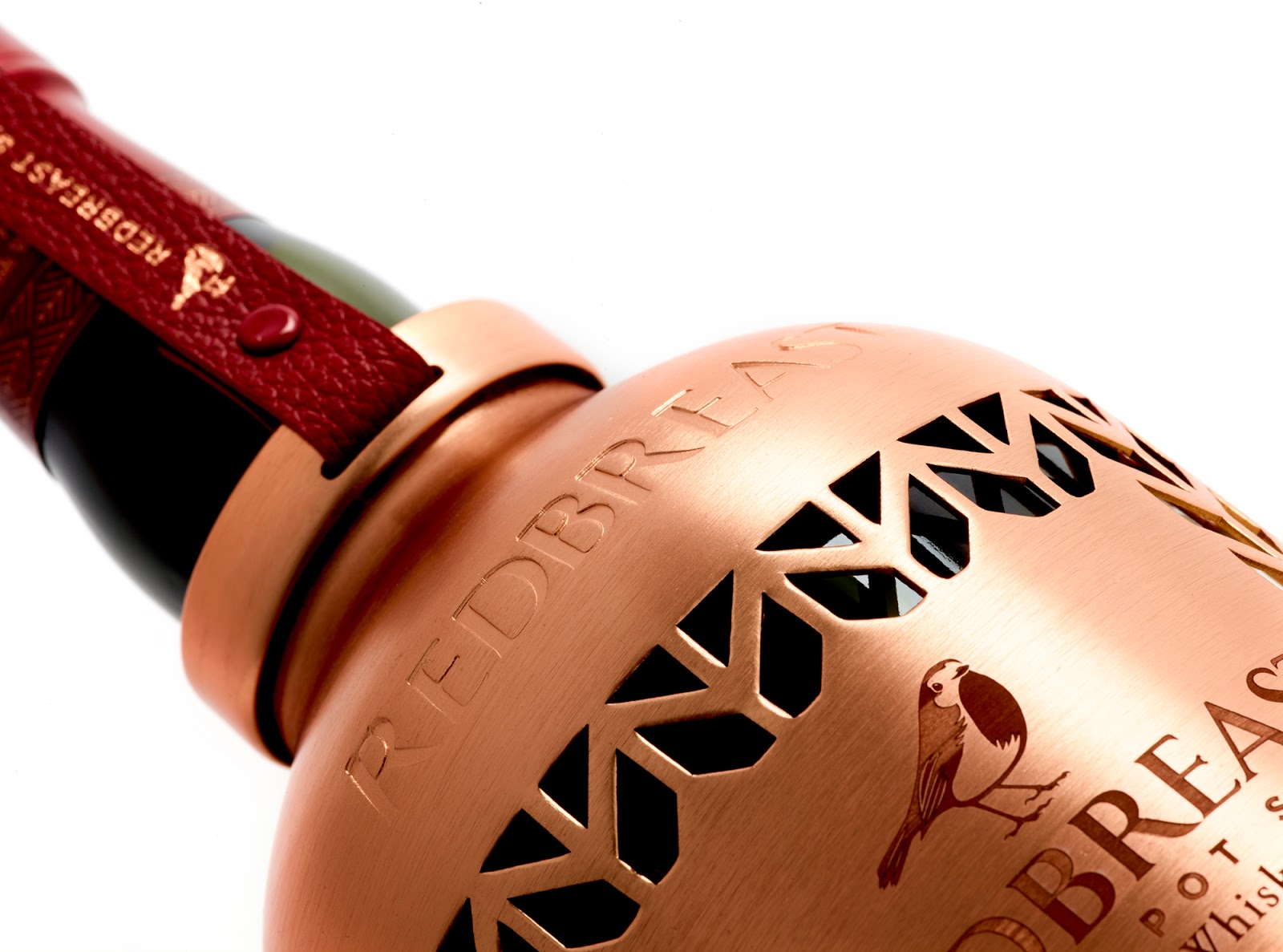 Результатом работы стал алюминиевый кейс для бутылки, который можно и нужно использовать в качестве кормушки для птиц. Верхняя часть, которая одевается на бутылку и накручивается на специальное основание, оформлена фирменными элементами бренда Redbreast, а также вырезным узором «ёлочка».
