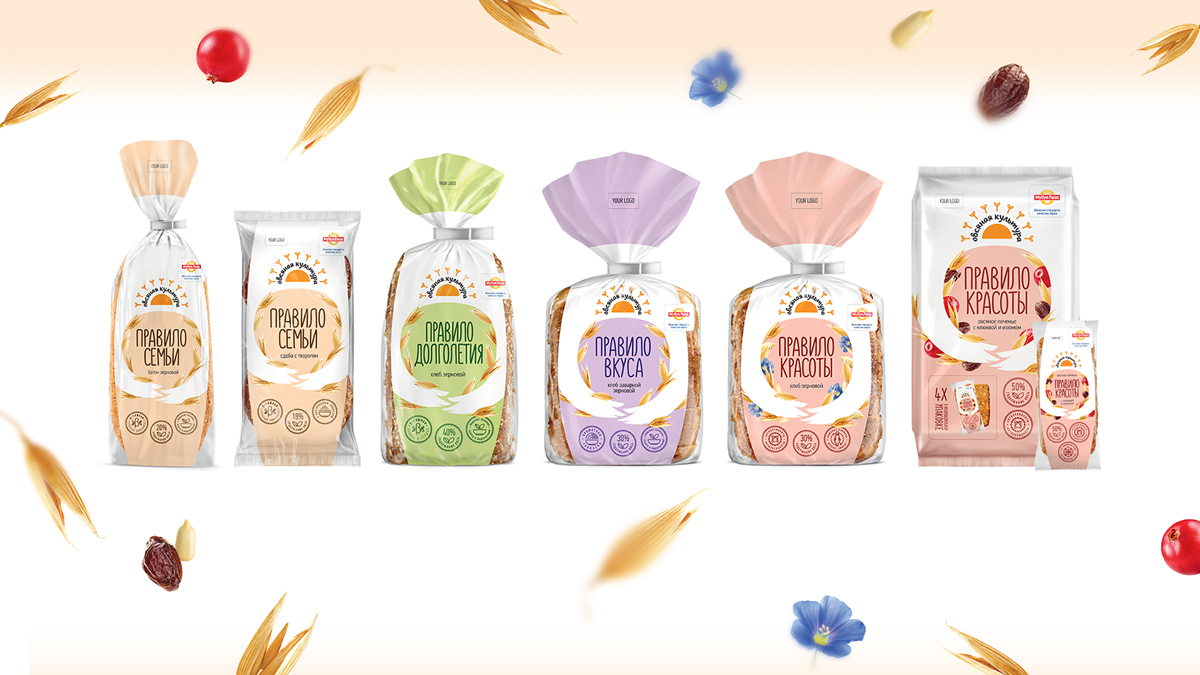 Основой концепции стала комбинация дружественного логотипа и стилеобразующего элемента — ручек с колосьями. Это сочетание обеспечивает единство всей линейки и отражает ее ключевую характеристику — продукты для заботы о здоровье и фигуре. А еще оно создает дополнительные ассоциации с мягкостью белого хлеба. Идею воздушности и красоты продолжает изящный леттеринг и нежная цветовая гамма. Инфографика и клеймы подчеркивают главные преимущества продукта, такие как состав и польза. Логотип поставщика «Myllyn Paras» убеждает в качестве зерновых ингредиентов, способствует доверию аудитории. Также предусмотрена зона для размещения логотипа конечного производителя.
