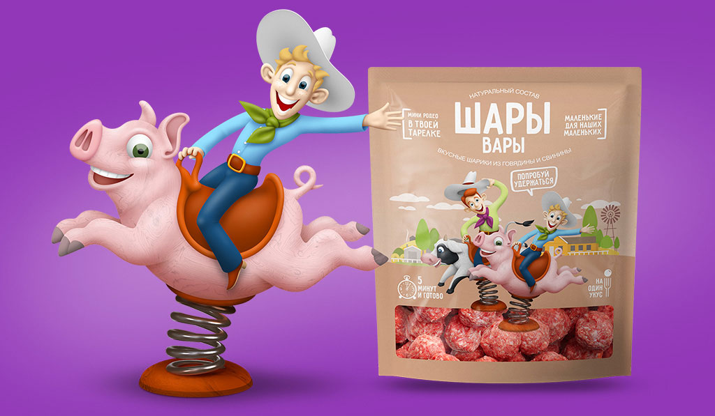 За основу взята концепция родео, визуал подкреплен слоганом «Попробуй удержаться!». Объемные и эмоционально-окрашенные иллюстрации ковбоев на индюшке, корове, свинке или курочке, цепляют взгляд проходящих мимо полки детей. Наши иллюстраторы доработали также товарный знак «Шары-Вары» со строгих на более плавные и скругленные линии.