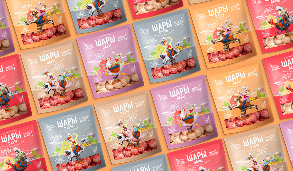 Шары-Вары — это бренд шариков из отборного охлажденного мяса индейки, курицы, говядины или свинины, на основе которых можно приготовить любое блюдо для самых маленьких. Задача по разработке дизайна упаковки состояла в том, чтобы сочетать яркую, цепляющую детский глаз ассоциативную картинку с сильными RTB (рациональными выгодами потребителя) и заинтересовать к первой покупке.