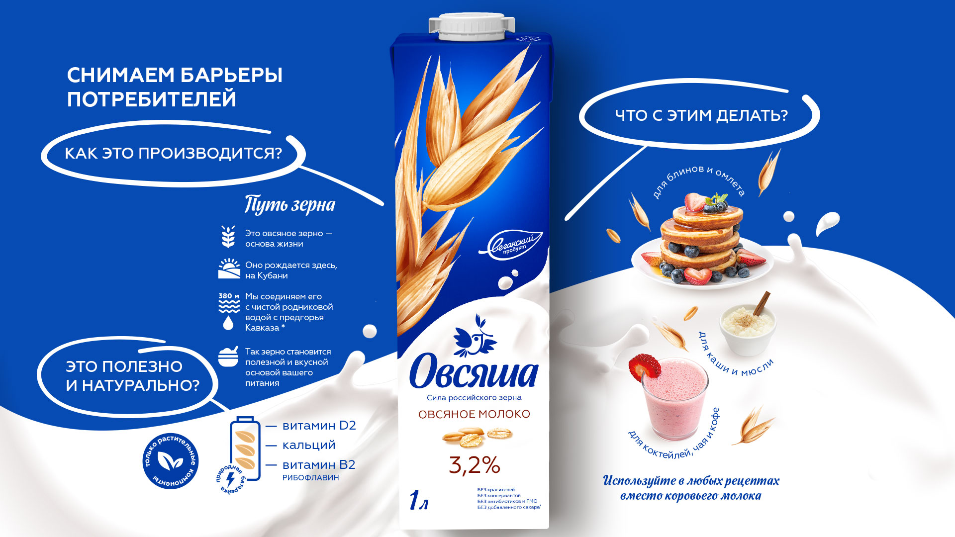 Растительное молоко пока покупает относительно небольшая часть населения. Его можно пить в «чистом» виде, его можно использовать для приготовления вкусных и разнообразных блюд. Поэтому не менее важно привлечь огромную аудиторию новых пользователей, которые пока не покупают растительное молоко из-за недостаточного понимания сути этого продукта или излишне радикального брендинга существующих марок.