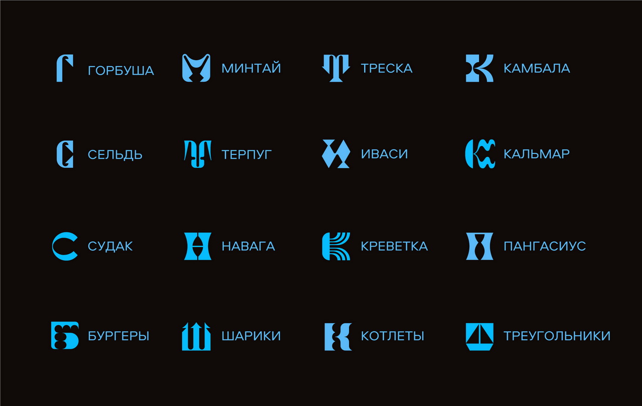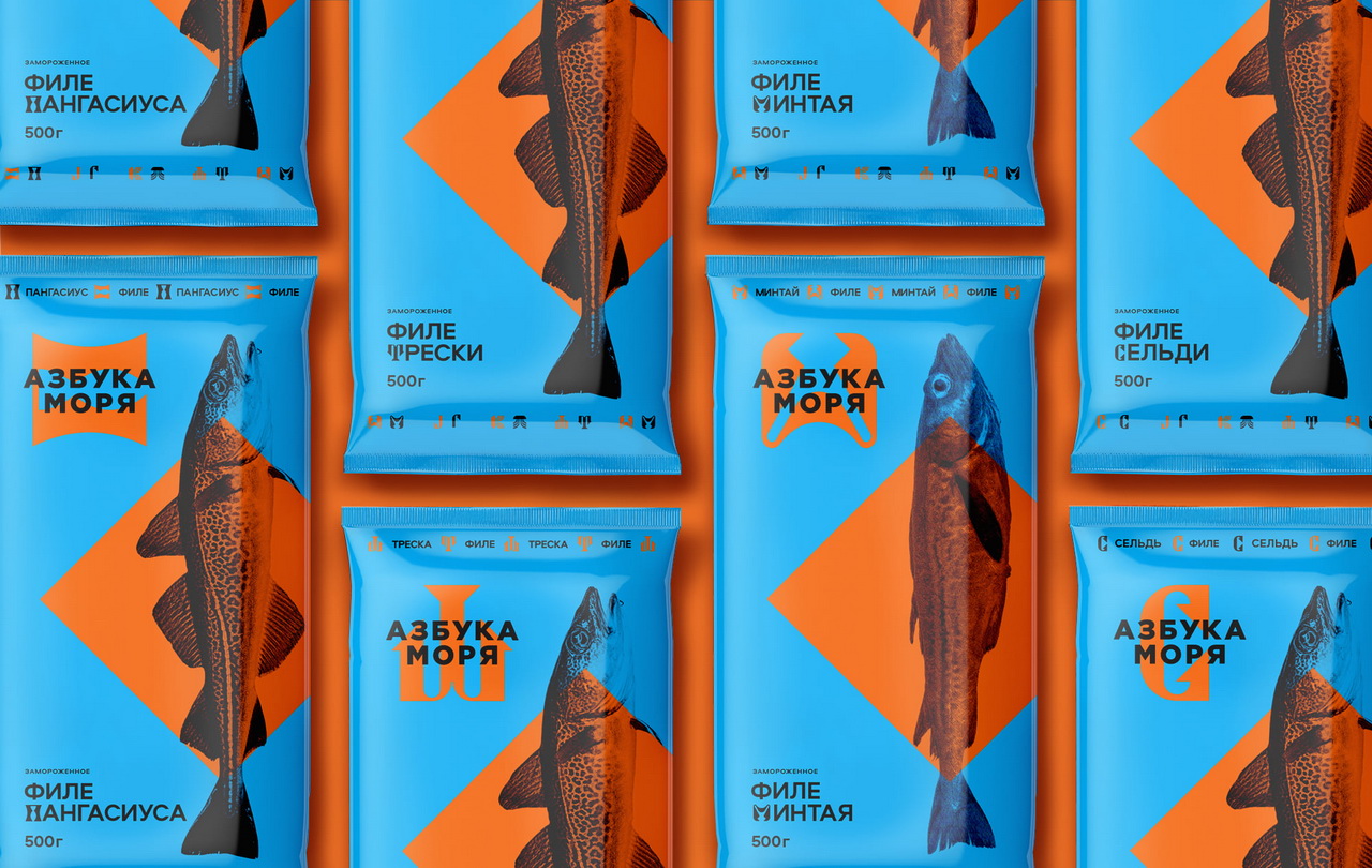 Новый дизайн требовался для нескольких форматов: пакет, коробка и наклейка-стикер. В агентстве предложили яркое оранжево-голубое цветовое сочетание и свой алфавит: для каждой рыбы или полуфабриката была разработана буква-знак — первая буква названия, навеянная морскими образами.