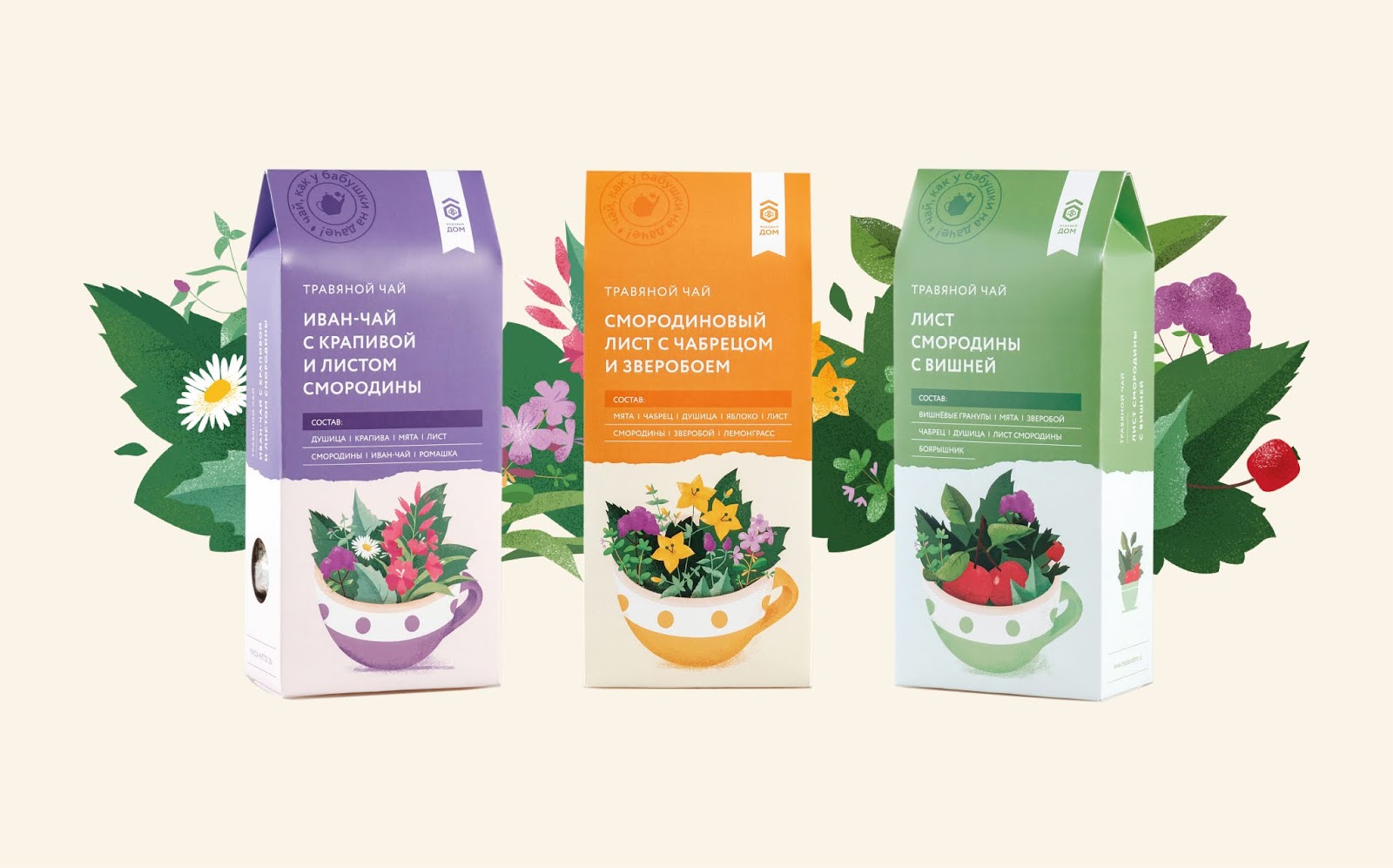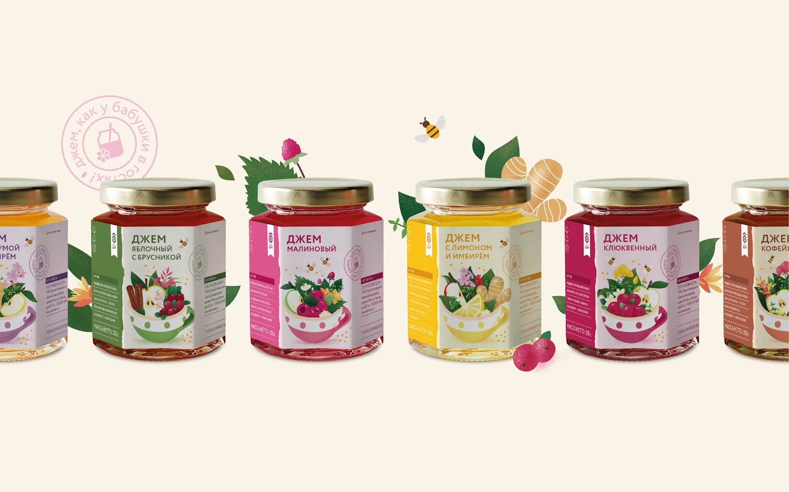 Вкусы разделяются цветами, которые добавляют целостности и яркого акцента упаковке. Всего создано 3 вкуса чая и 8 вкусов джема.