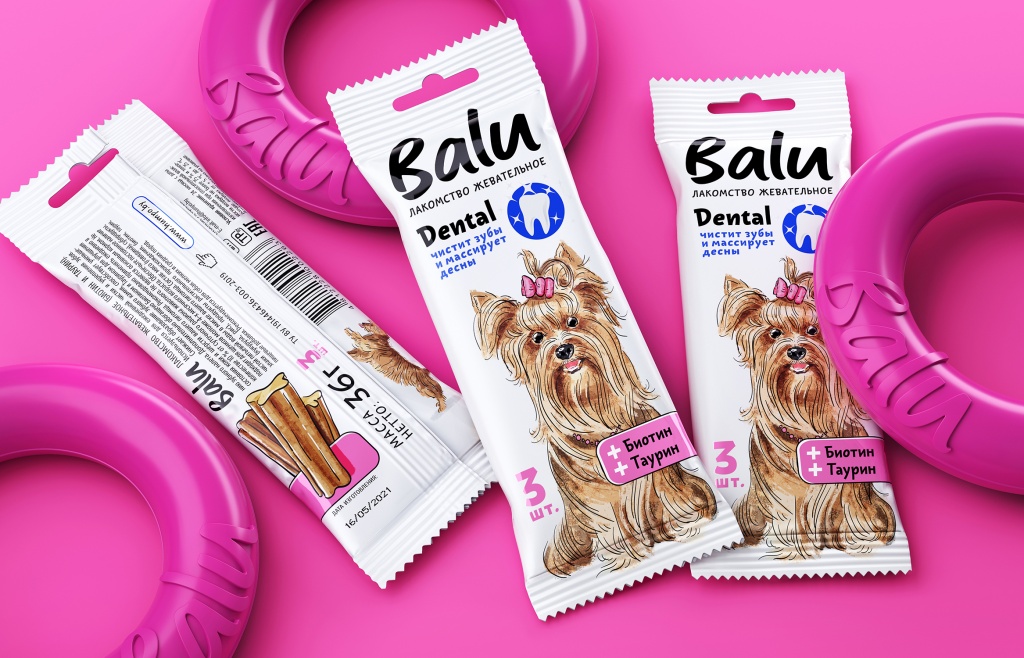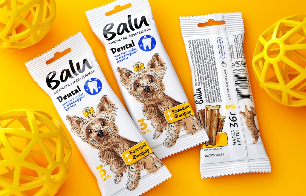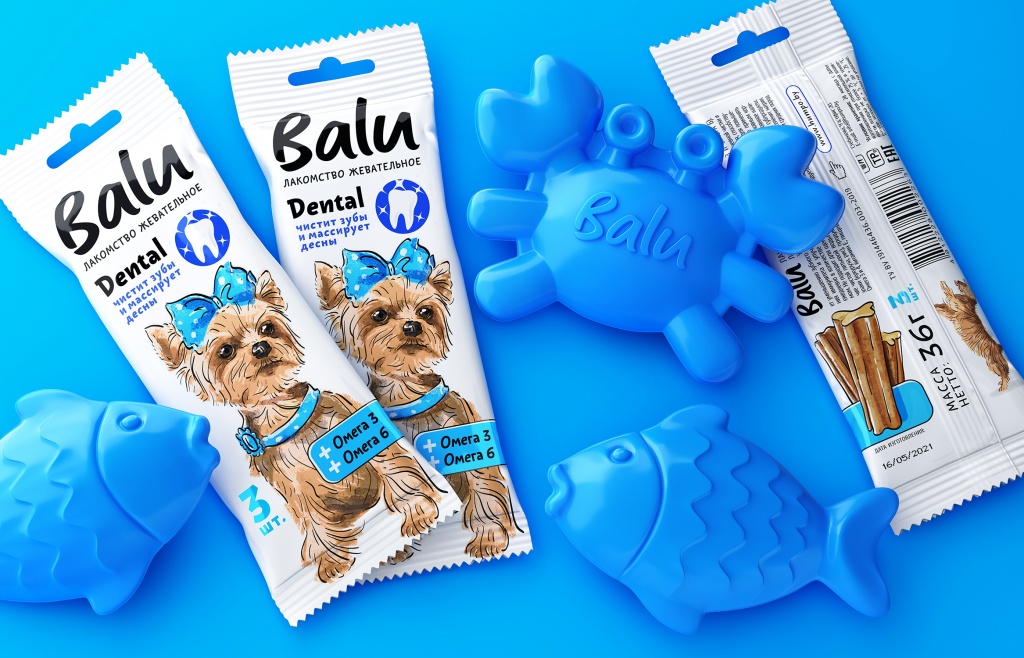 Дизайн-студия Акима Мельника разработала фирменного персонажа и дизайн торговой марки BALU — полезного жевательного лакомства для собак.