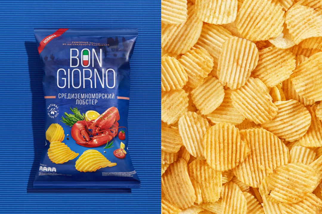 На полках появились рифленые чипсы Bon Giorno — бренда, уже заслужившего лояльность потребителей на российском рынке. Дизайн упаковки для новой линейки разработала команда Fabula Branding.