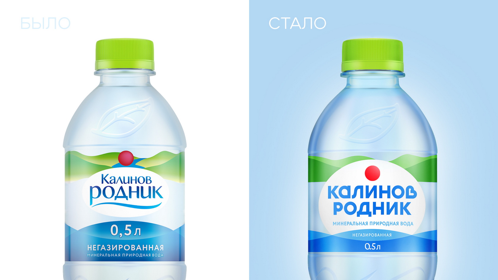 Чистота и природа во всем — таким принцип следовала команда BBDO. Композиция сбалансирована и не содержит лишних элементов, а цвета стали более мягкими и природными. При работе над этикеткой были переработаны, но сохранены важные элементы, которые подчеркивают именно природность и натуральность бренда «Калинов Родник»: одноцветные рельефы зелёных гор, русская ягода калина, которая осталась частью нового логотипа, спокойной природный голубой цвет волн.