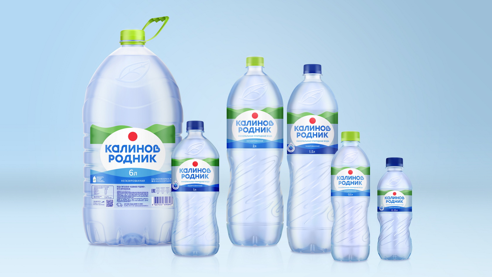 Обновление логотипа затронуло этикетки очень широкой линейки литража бренда «Калинов Родник», а это порядка 18 SKU. Здесь присутствуют не только более привычные для розничного ритейла форматы 0.3, 0.5 или 1.5, но и крупные литражи — 6, 9 и 18.9 литров.