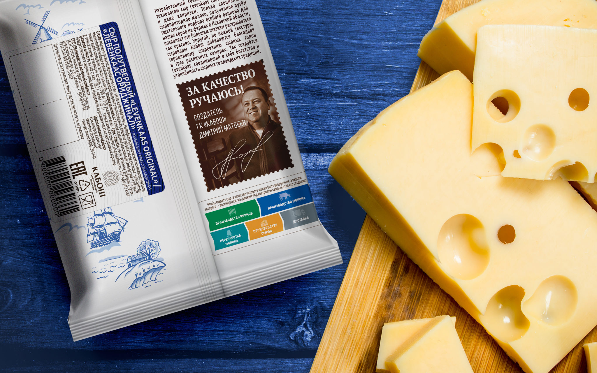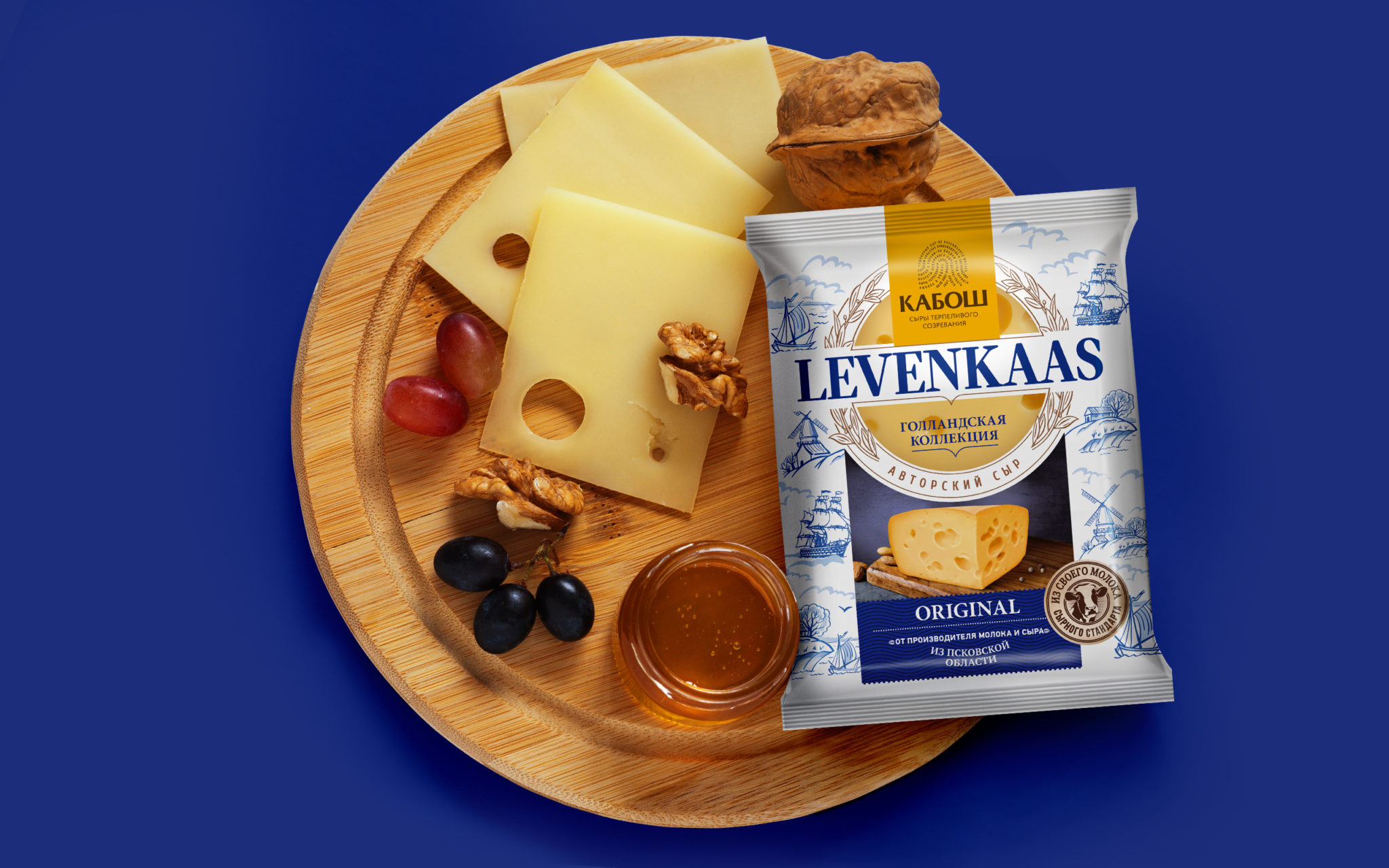 Линейка Levenkaas — один из сыров голландской группы. Все преимущества компании Кабош специалисты Getbrand перенесли на дизайн упаковки. Он выполнен в стилистике старинных голландских изразцов, изображающих мореплавание и путешествия. Желтый логотип Кабош имеет небольшую, но заметную зону, которую сразу видно, когда подходишь к полке.